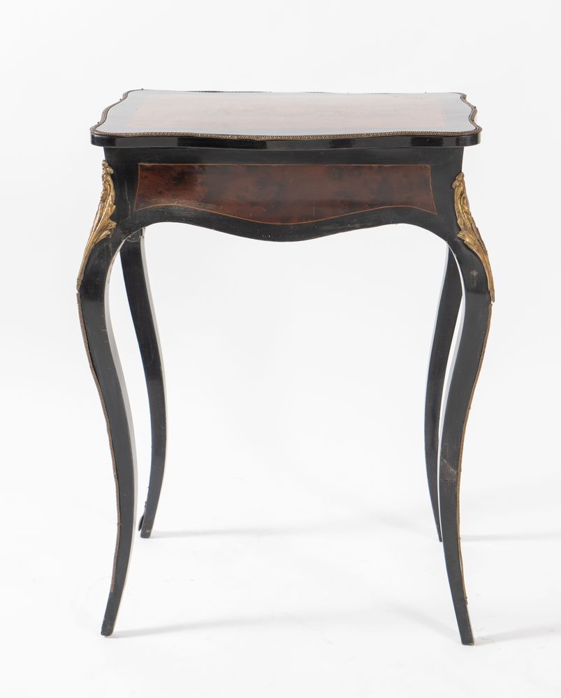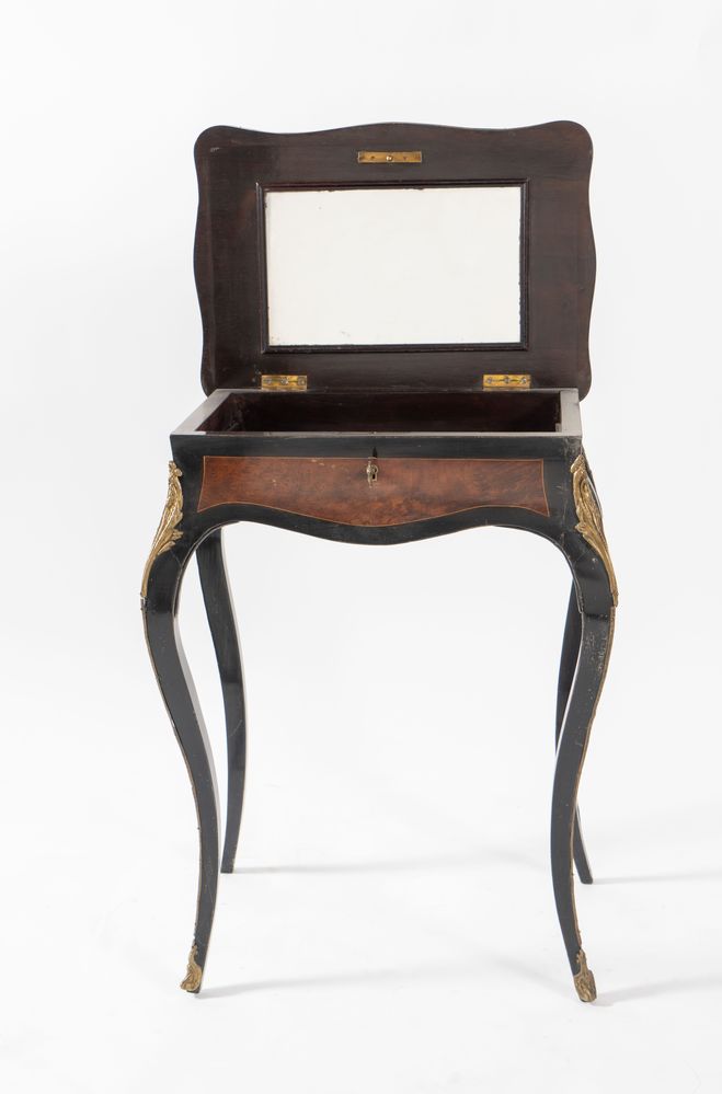 Tavolino da lavoro Napoleone III lastronato in legno ebanizzato con riserve in radica e intarsi in acero ed essenze esotiche. Francia, ultimo quarto XIX secolo. Reca bordature in bronzo dorato, piano apribile a ribalta celante vano e specchio applicato al coperchio. Cm 72x54x39,5.