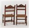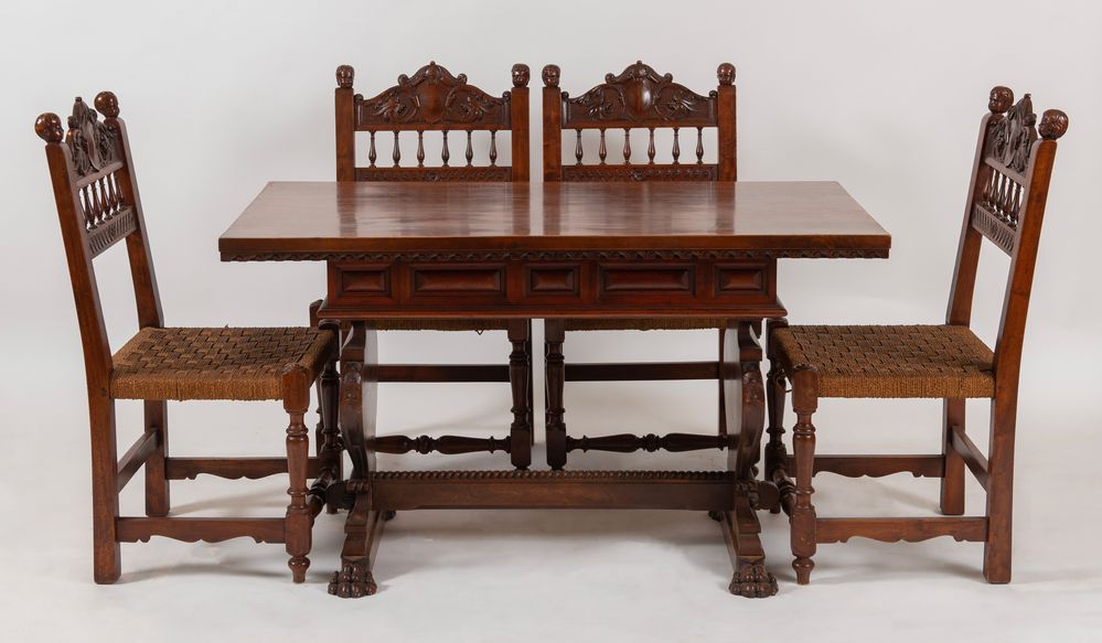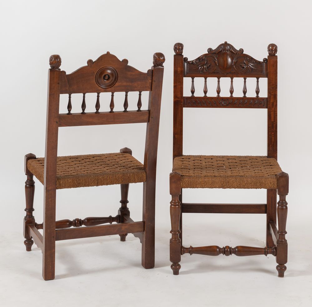 Lotto composto da quattro sedie e tavolo da bambini di gusto rinascimentale in legno di noce intagliato e tornito. La sommità dei piantoni delle sedie è magistralmente intagliata con teste di bambini. Bologna, XIX secolo. Tavolo: cm 64x110,5x61,5; sedie: cm 83x42x39.