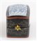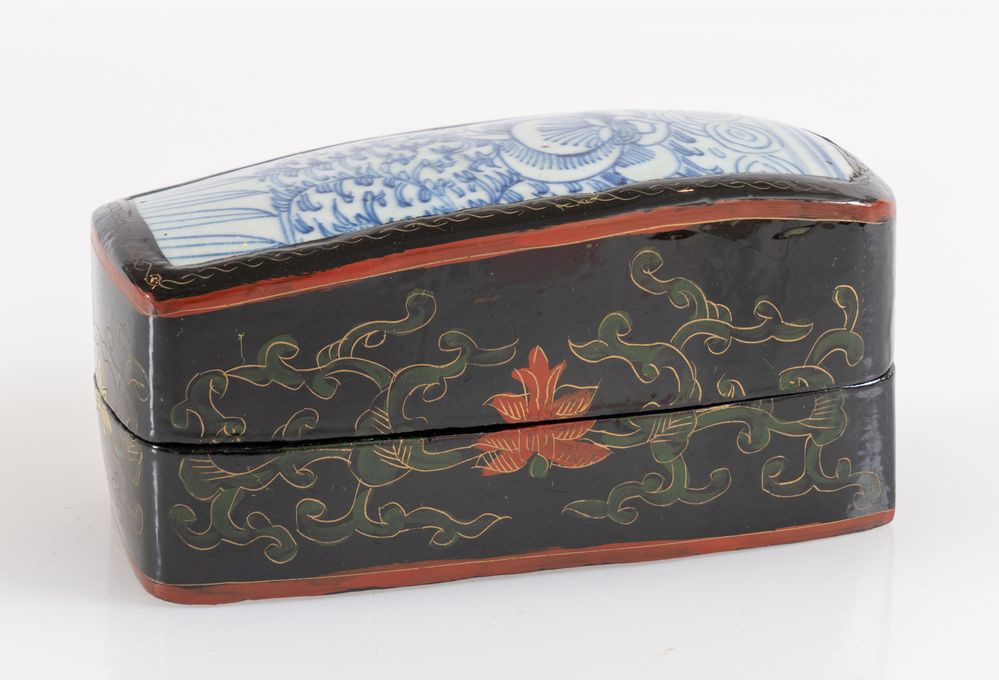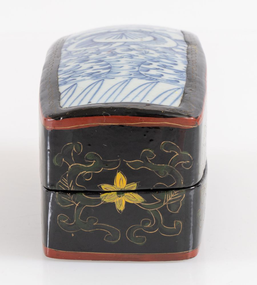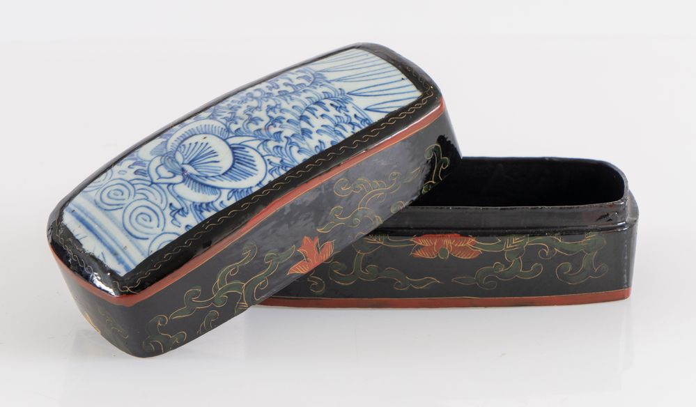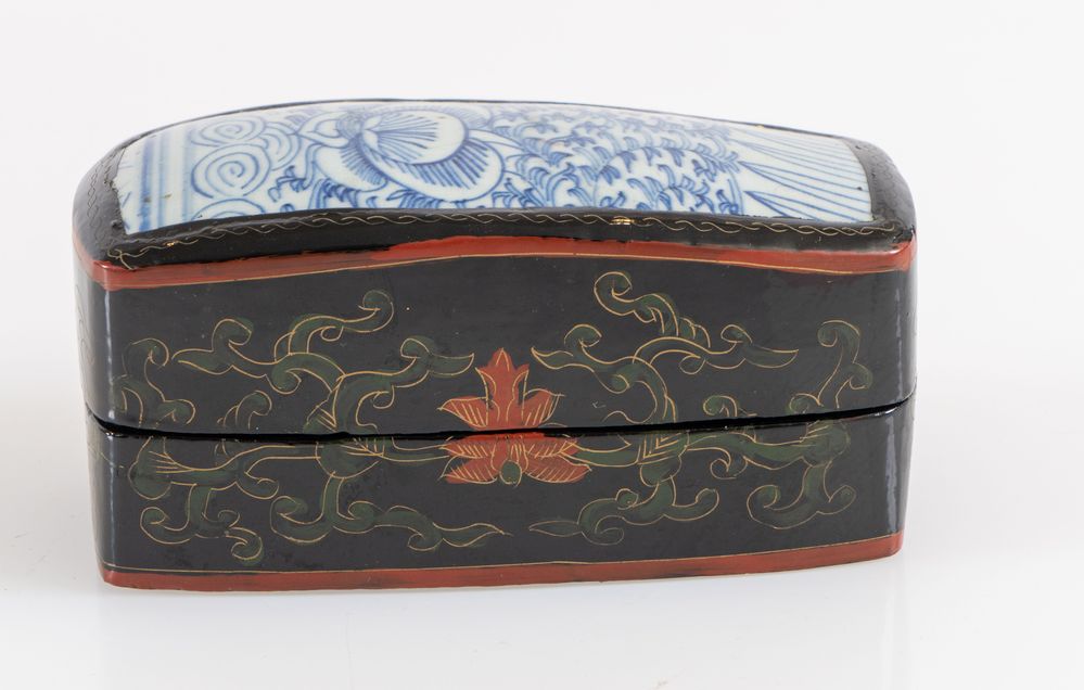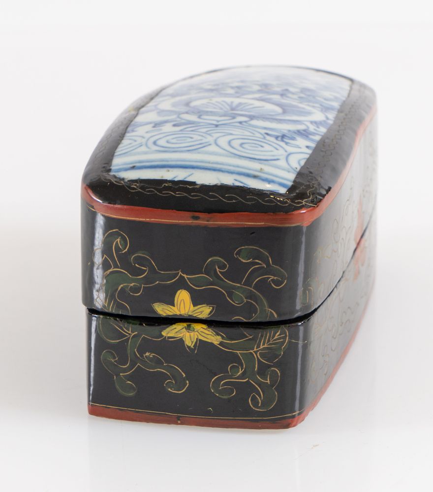Scatola in legno in lacca cinese con inserti nel coperchio di frammenti di vasi antichi di porcellana decorati sui toni del bianco e del blu. Cina, XX secolo. Cm 8x9,7x14,5