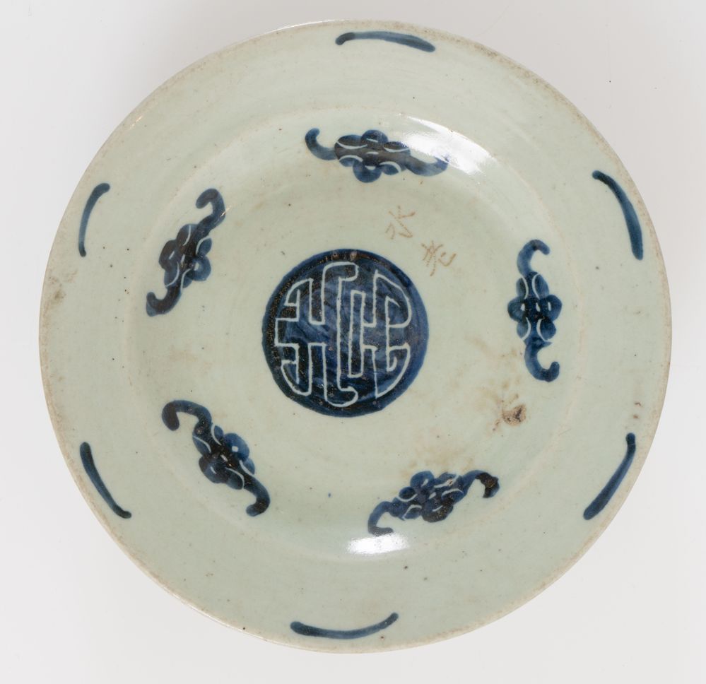 Piatto antico in ceramica decorato sui toni del blu. Contenuto in scatole cinesi del XX secolo. Cm 3,5x22,2
