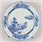 Grande vassoio in porcellana monocroma blu con pagode e paesaggi fantastici. Cina, XVIII secolo. Diametro cm 34,4. (sbeccature visibili lungo il bordo)
