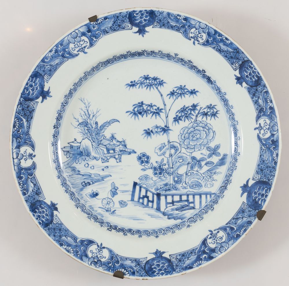 Grande vassoio in porcellana monocroma blu con tre figure entro ambiente domestico. Cina, XVIII secolo. Diametro cm 35,6. Al verso decori con rametti fogliati. (buono stato di conservazione)