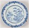 Grande vassoio in porcellana monocroma blu con tre figure entro ambiente domestico. Cina, XVIII secolo. Diametro cm 35,6. Al verso decori con rametti fogliati. (buono stato di conservazione)
