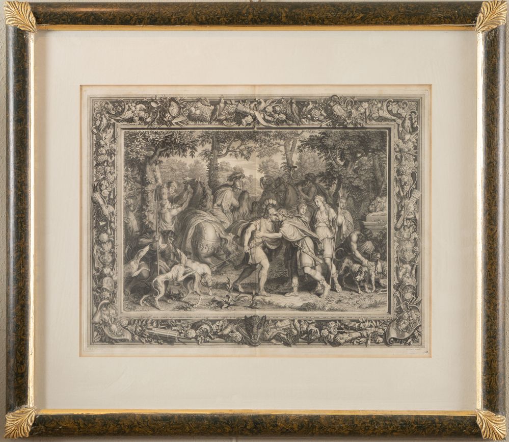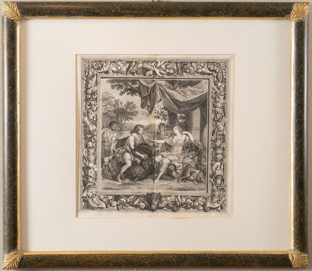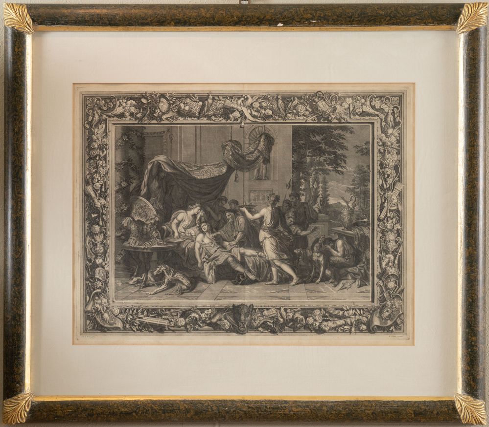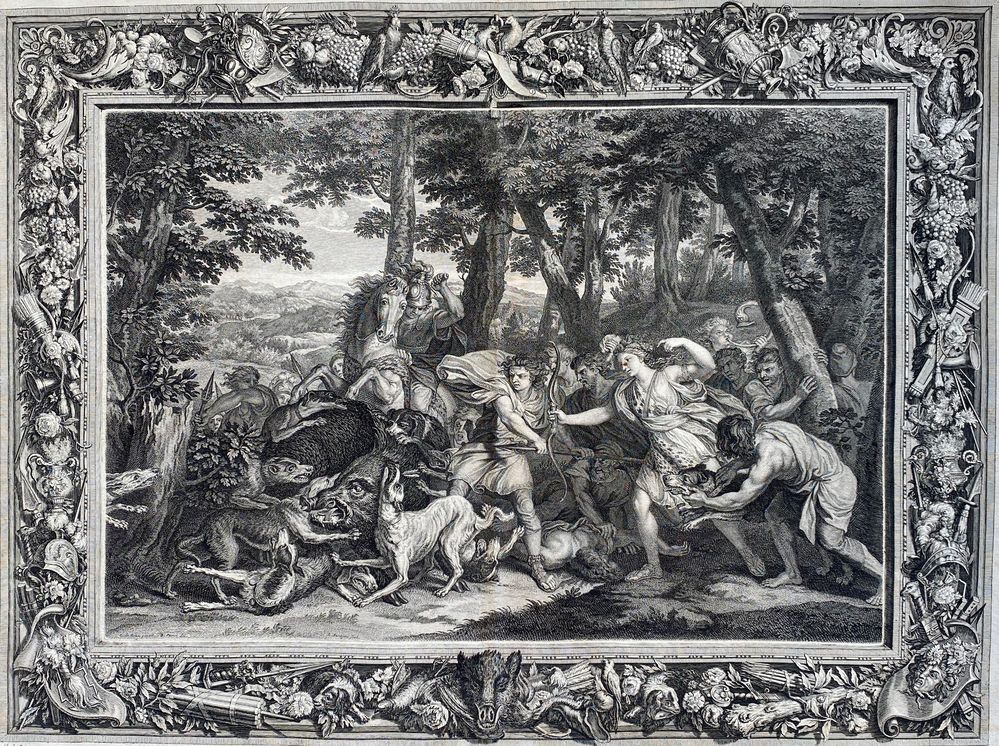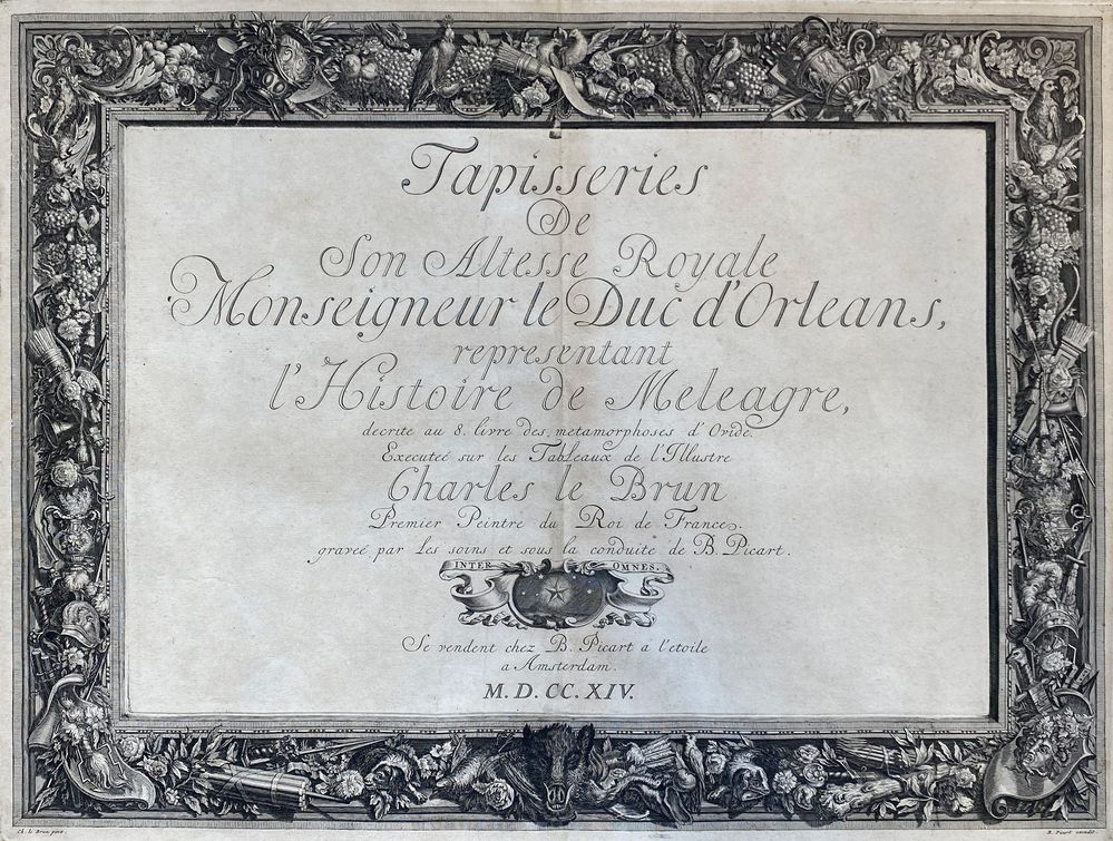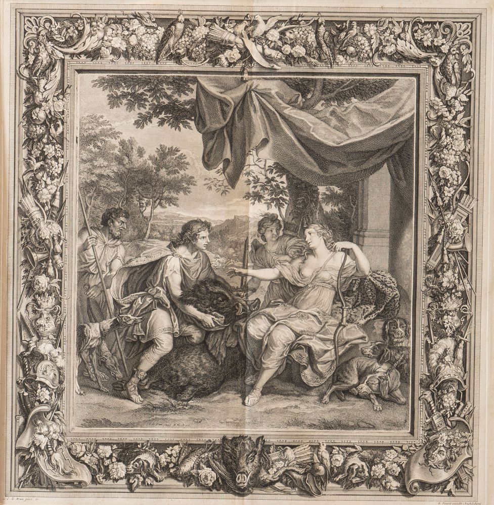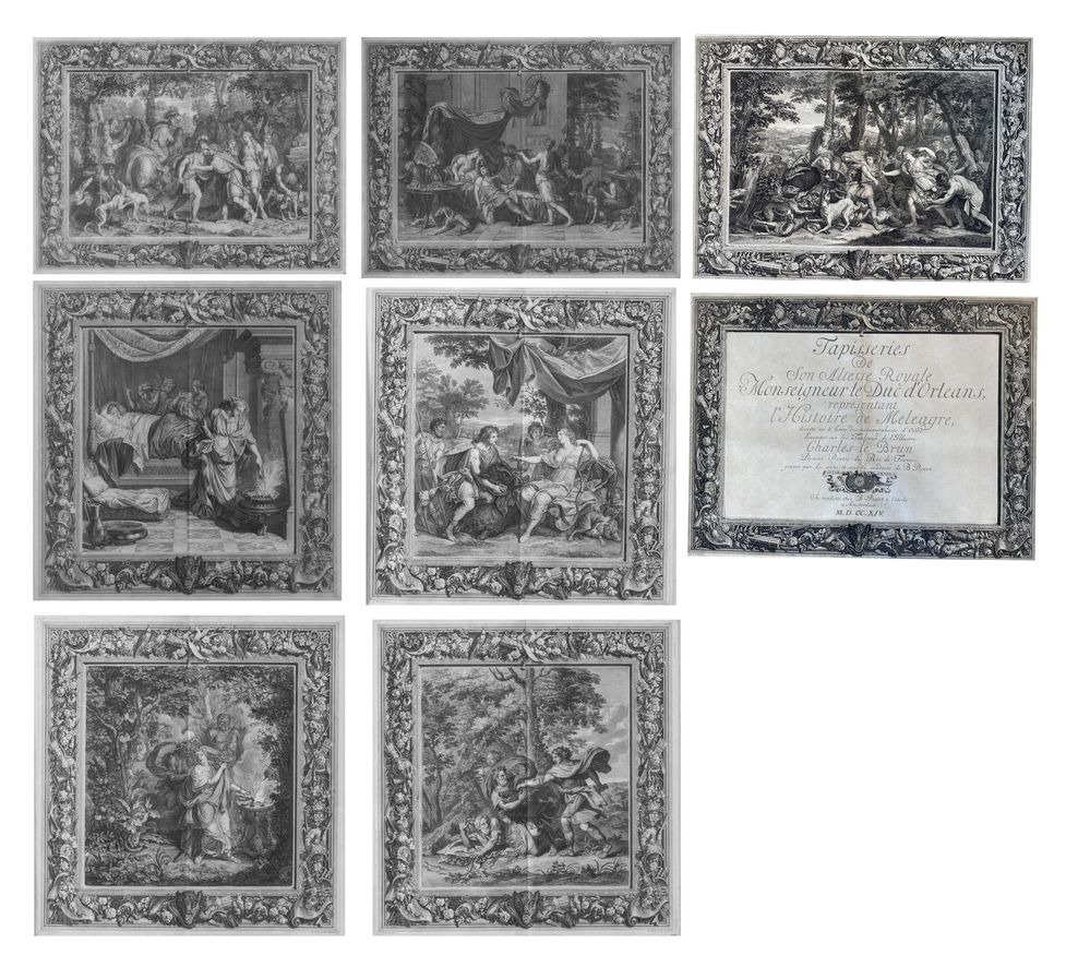 Lotto composto da otto antiche stampe raffiguranti le storie di Meleagro dai dipinti di Charles Le Brun presso la Reggia di Versailles. Cm 40x54.