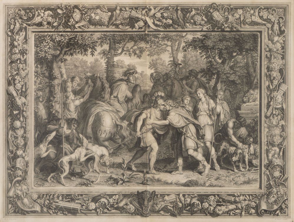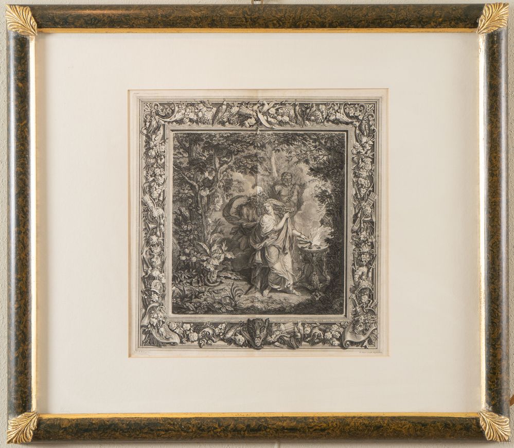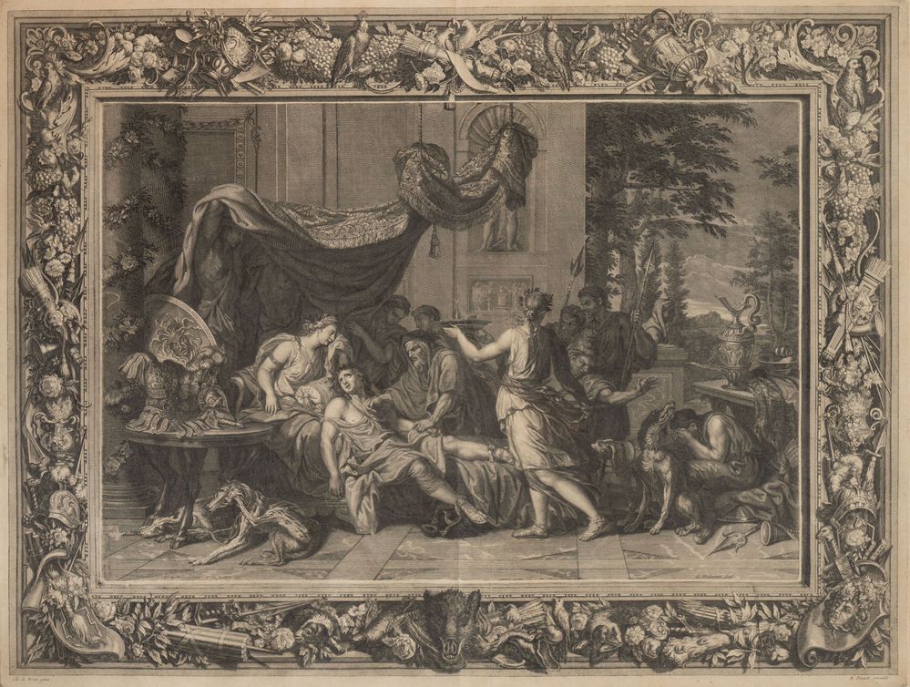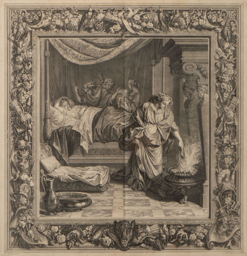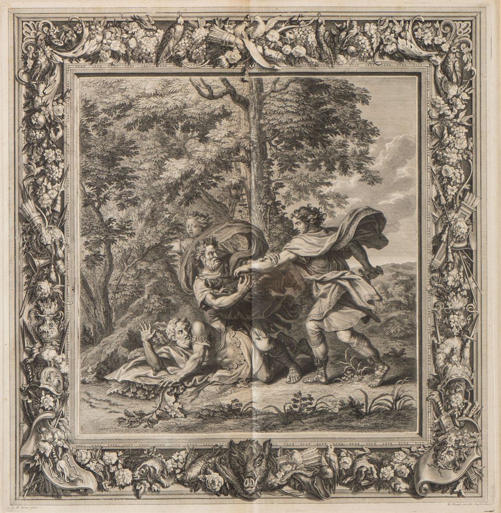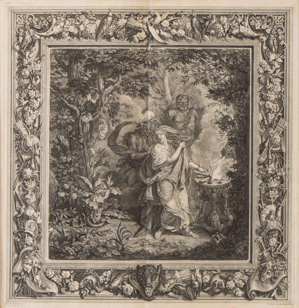 Lotto composto da otto antiche stampe raffiguranti le storie di Meleagro dai dipinti di Charles Le Brun presso la Reggia di Versailles. Cm 40x54.