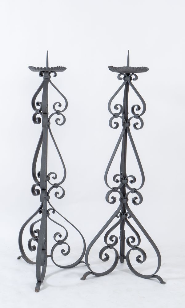Coppia di torciere in ferro battuto a mano impreziosite da riccioli contrapposti. Italia, fine del XVII inizio XVIII. Recano piatto smerlato nella parte alta. Riverniciati in color ferro micaceo in epoca recente. Cm 144x46x53.