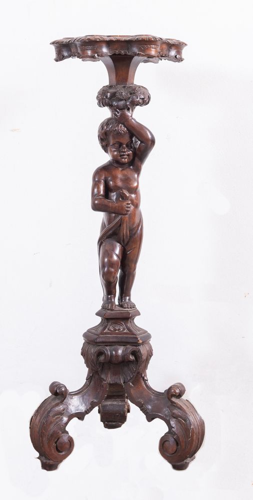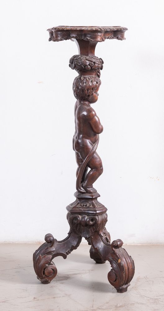 Gueridon in legno di noce intagliato. XIX secolo. Cm 96x40x40.