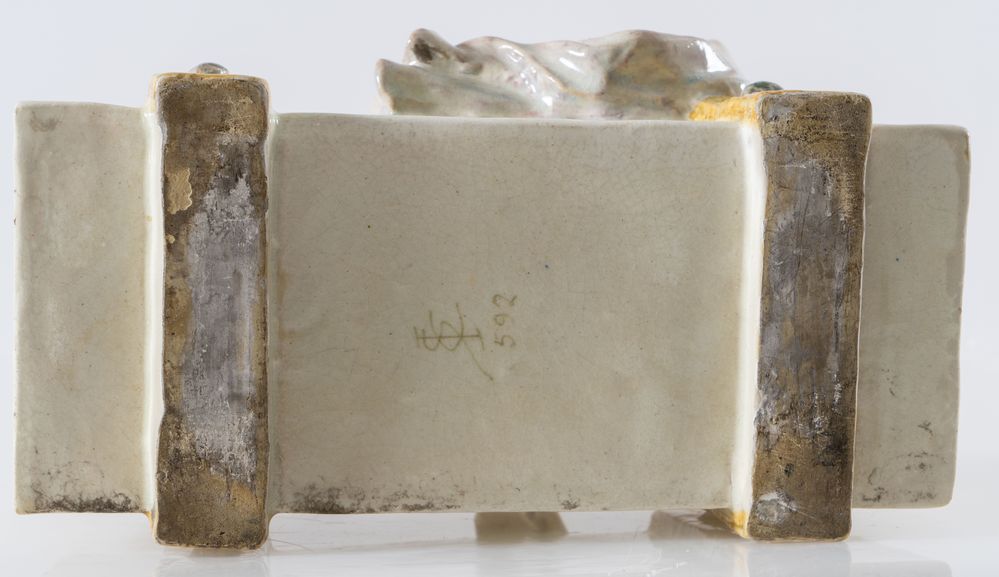 Portaoggetti in ceramica con putto. Prima metà del XX secolo. Cm 24x27x12. Alla base reca marchio SCC.