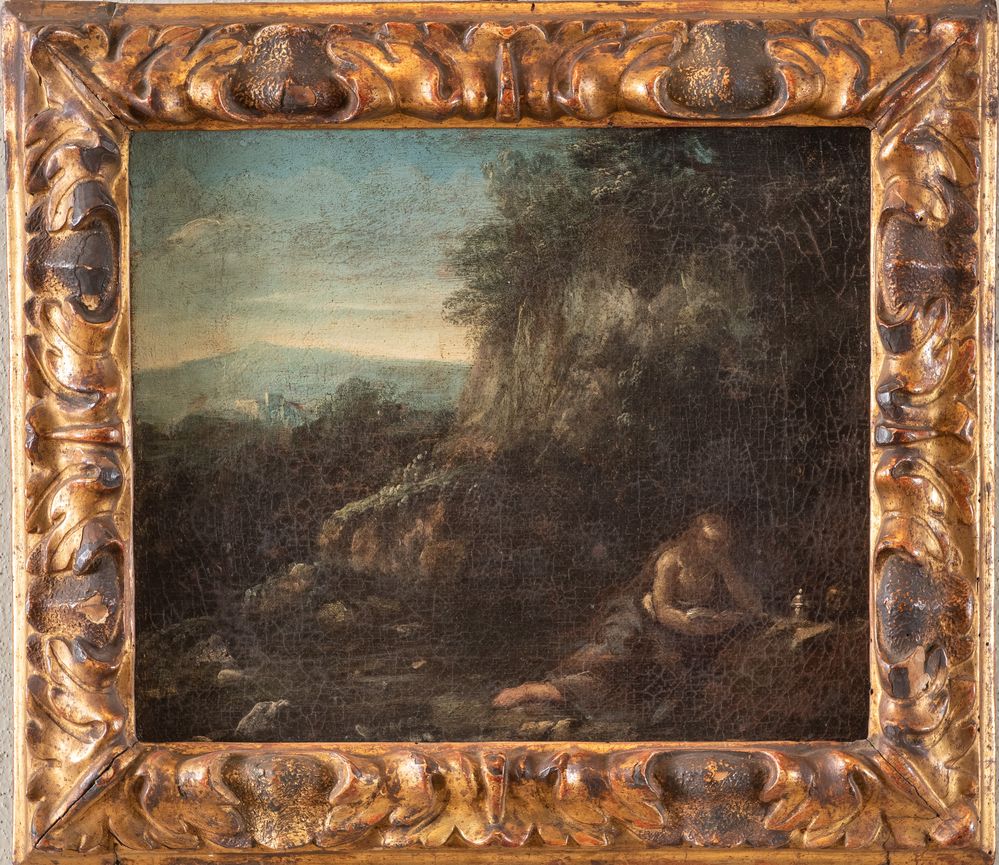 Maestro del XVII secolo. “Paesaggio con S. Francesco” “Paesaggio con Maddalena”. Coppia di oli su tela. Rispettivamente di cm 28,5x33,5. Recano cornici antiche.