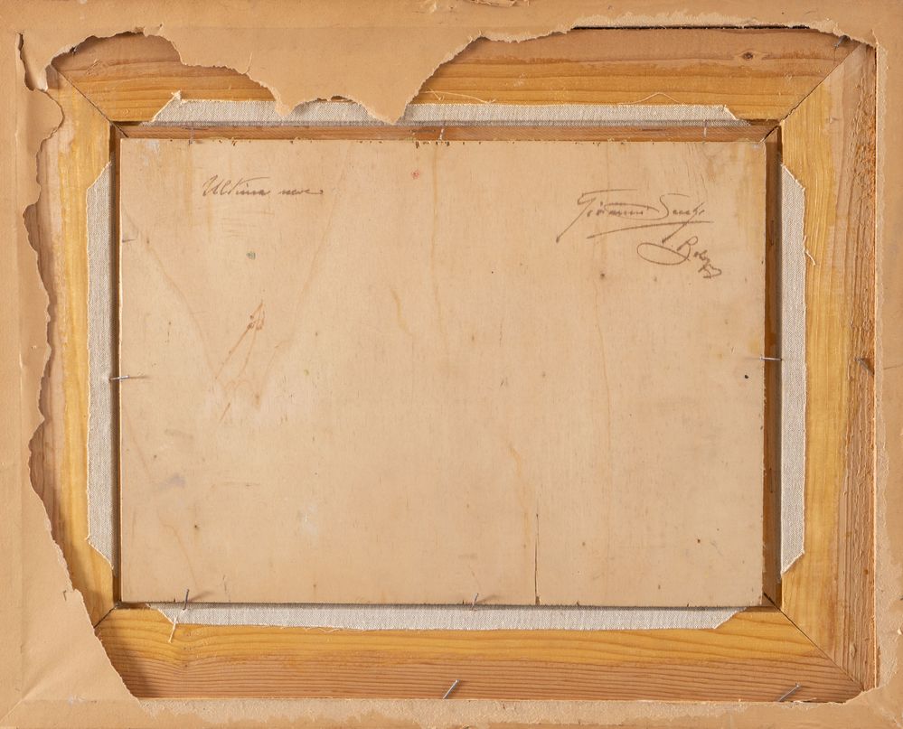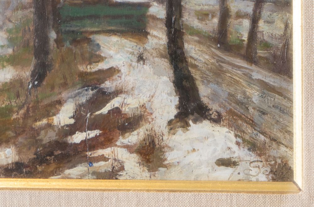 GIOVANNI SECCHI (Bologna 1876 - Darfo 1950) "Ultima neve". Olio su tavola. Cm 26x36. Opera firmata in basso a destra G. Secchi. Al retro opera intitolata e firmata Ultima Neve, Giovnni Secchi.