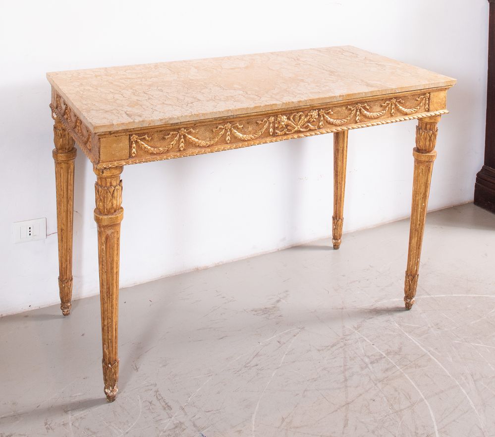 Consolle in legnato gessato e dorata. Piano in marmo giallo senape non pertinente. Seconda metà del XVIII secolo. Cm 91x133x67. (restauri)
