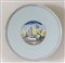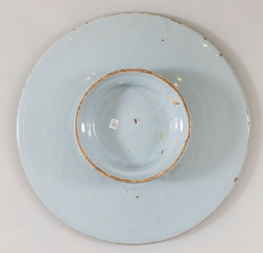 Alzata in ceramica con decoro policromo con paesaggio nell'umbone. Pavia, fine del XVII secolo. Diametro cm 24. Altezza cm 4,5. (presenta sbeccature diffuse lungo il bordo)