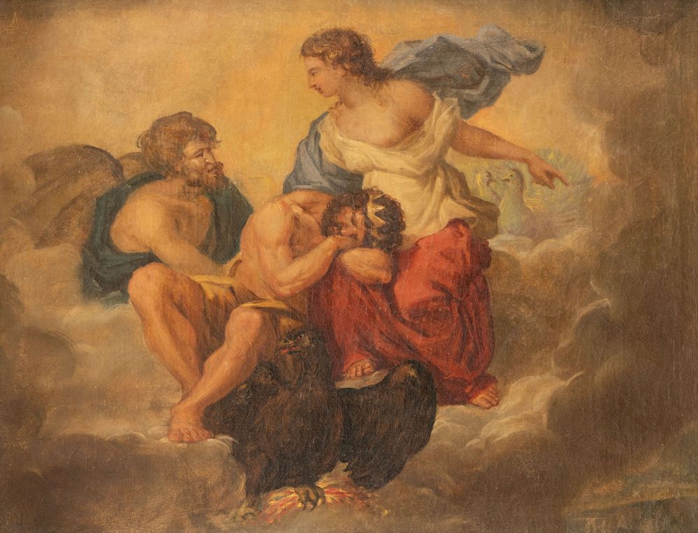 Maestro del XVIII secolo. "Giunone e Giove". Olio su tela. Cm 29x36,5.