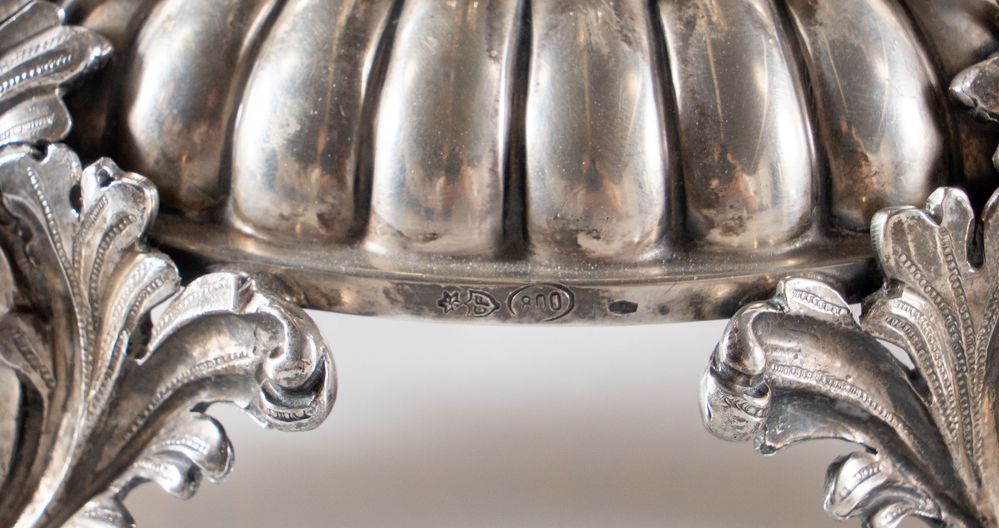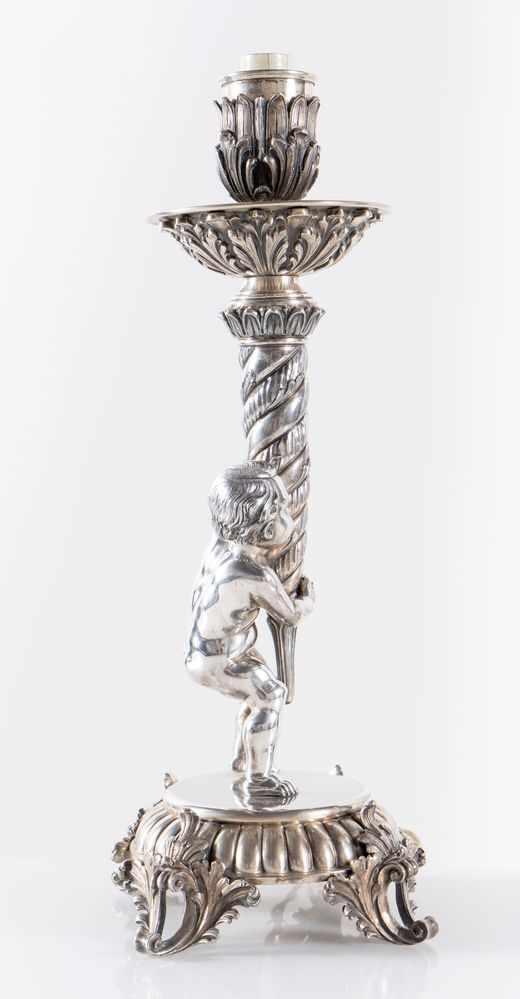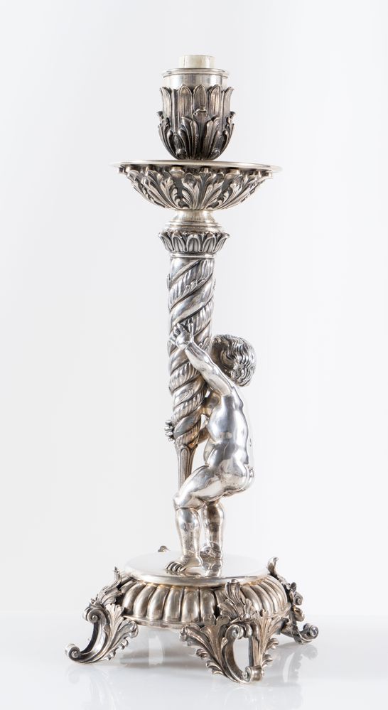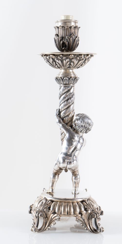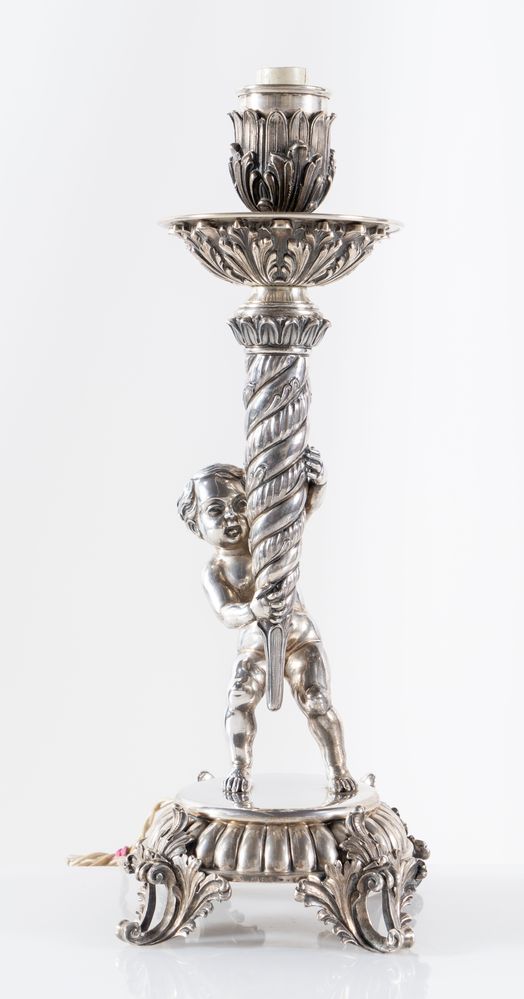 FARAONE, Milano, XX secolo. Lampada in argento 800, con putto e torcia. Sul...