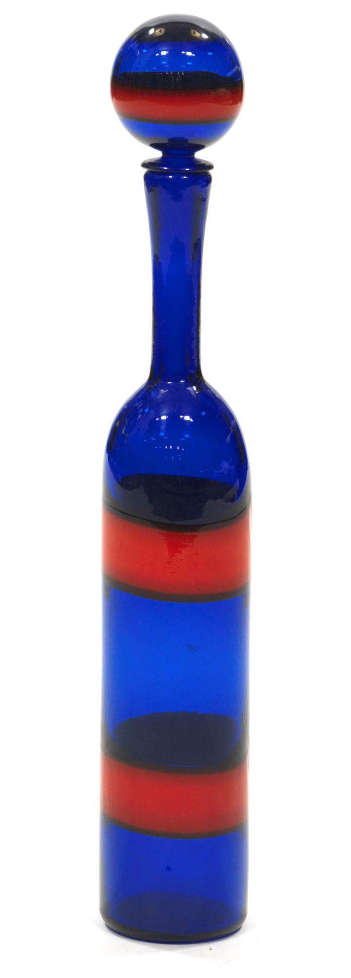 VENINI PAOLO Bottiglia in vetro zaffiro con fascia opalino rosso Inciso alla...