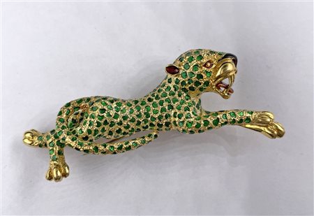 FRASCAROLO (attribuito). Spilla in oro giallo e smalti realizzata come un giaguaro in oro giallo, dettagli lumeggiati con smalti verdi e rossi, punzoni per Frascarolo. Peso complessivo: 30,04 grammi.