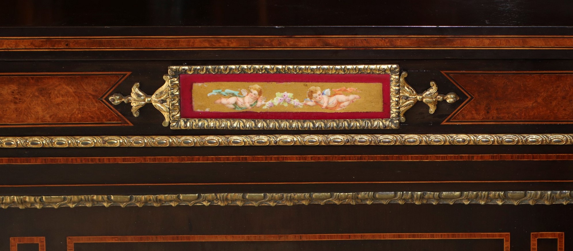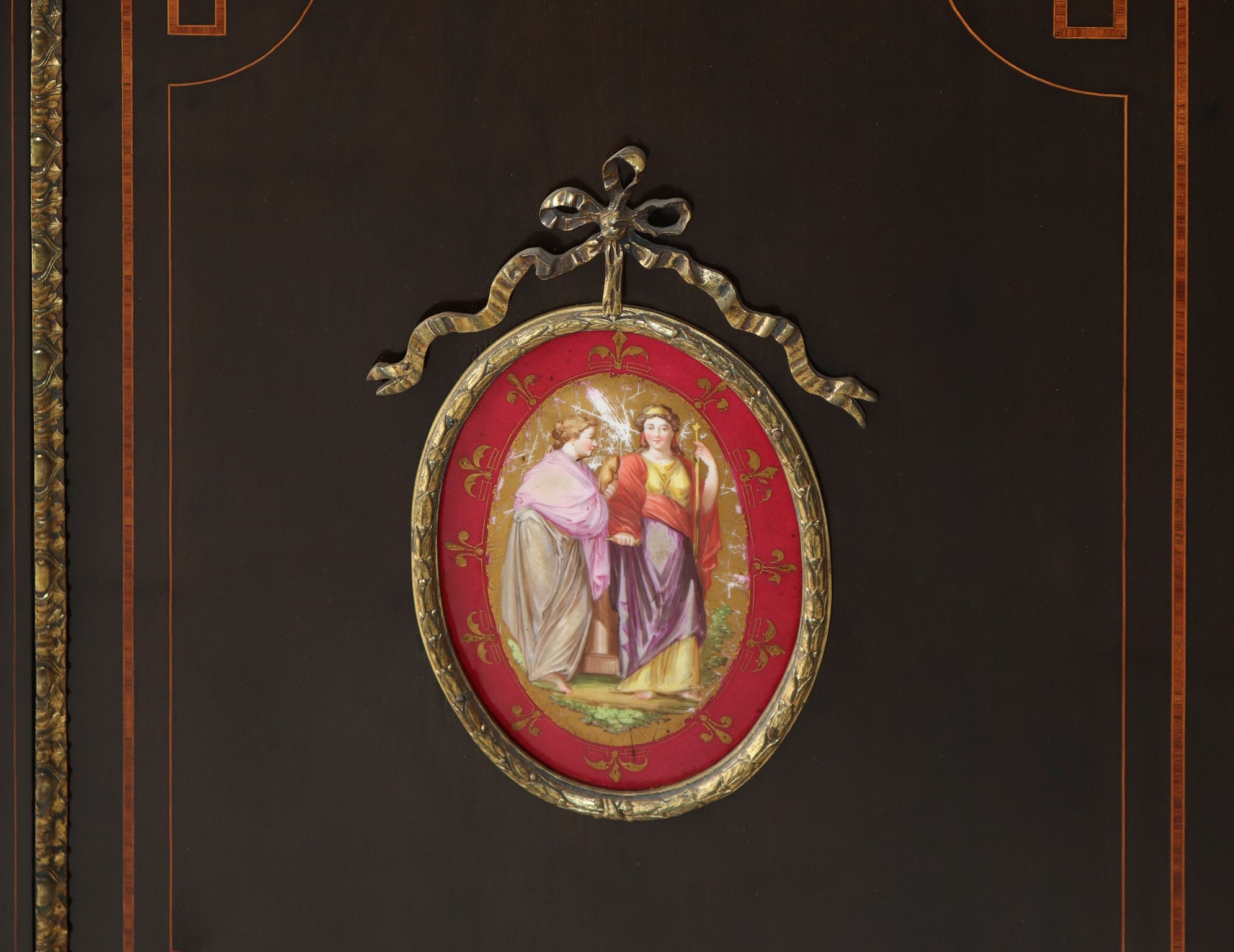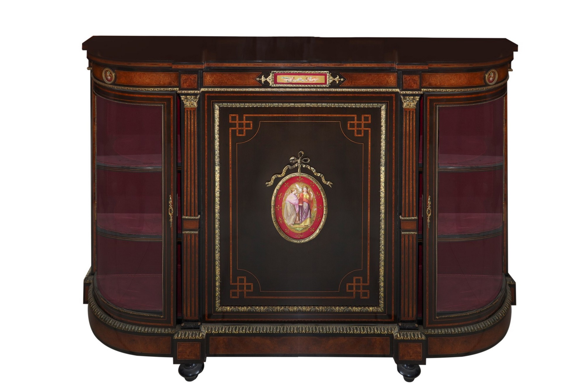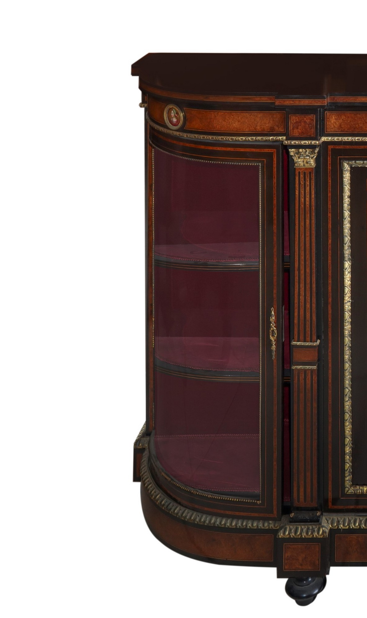 Etagere a sportello centrale, late 19th century H cm 108 x L cm 158 x P cm 40 Scena biblica dentro ovale in ottone, in testa nodo d'amore. A due sportelli laterali a vetri curvi. Cornici in metallo dorato alla base e nel sottopiano. Piano in legno.