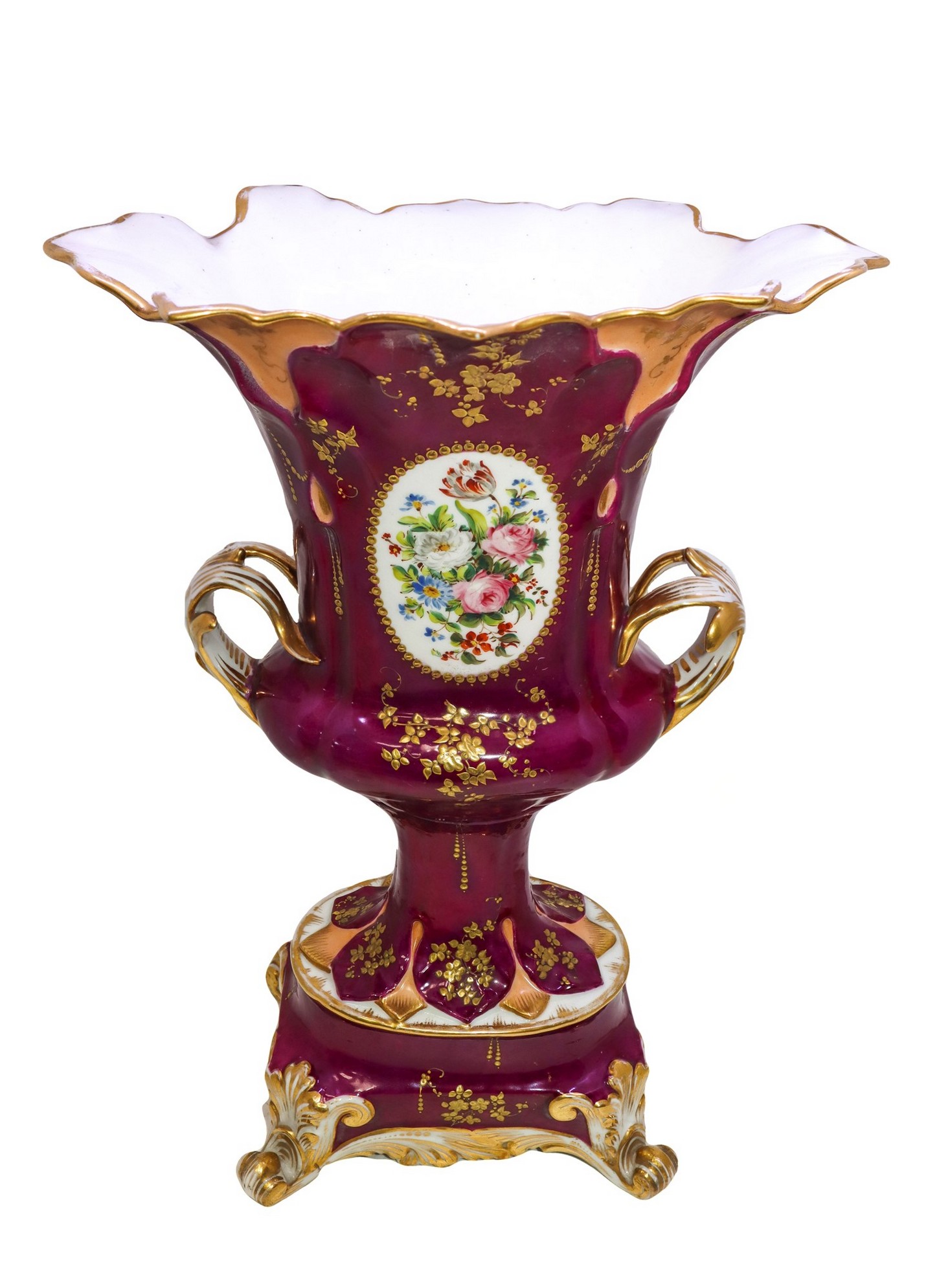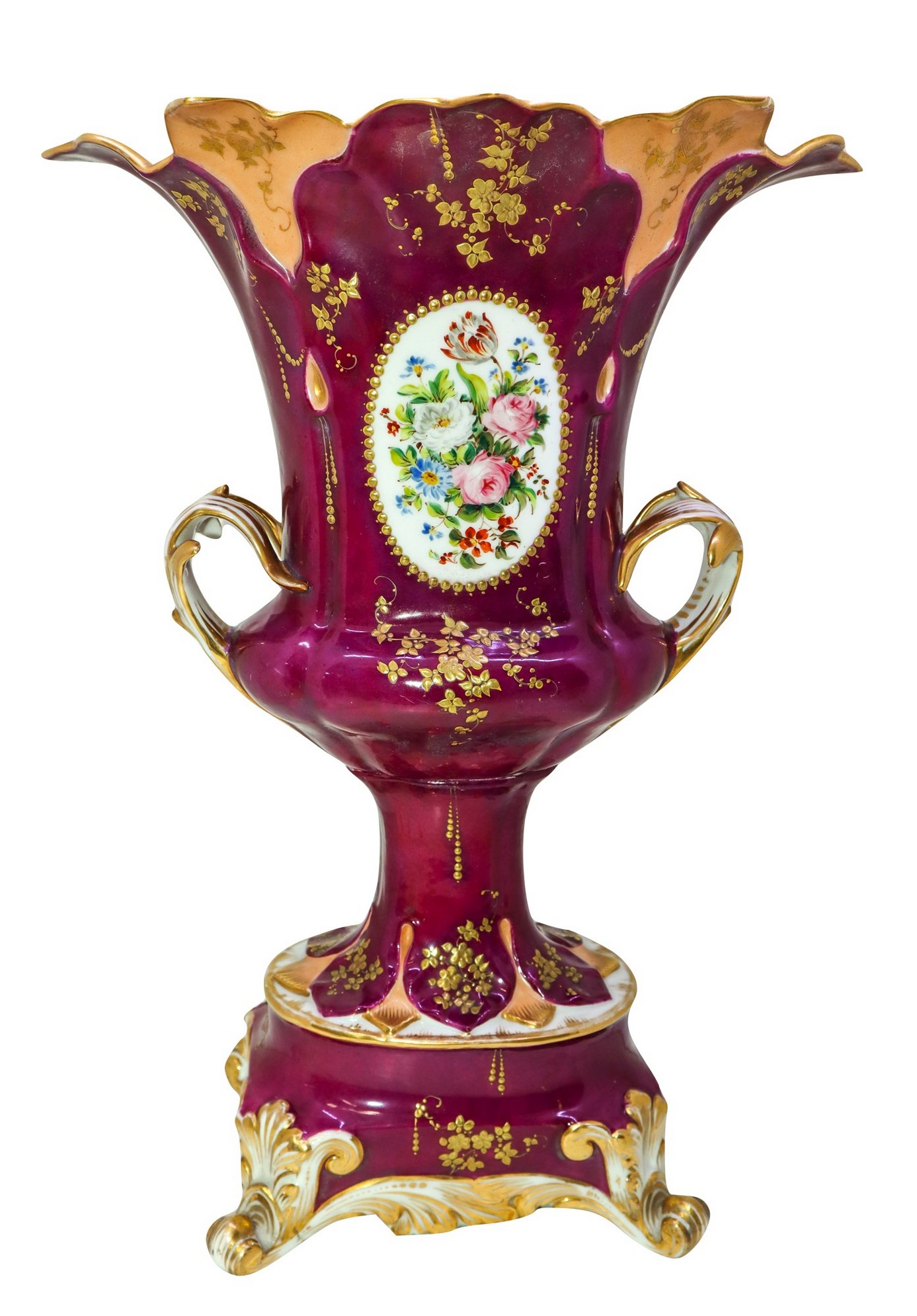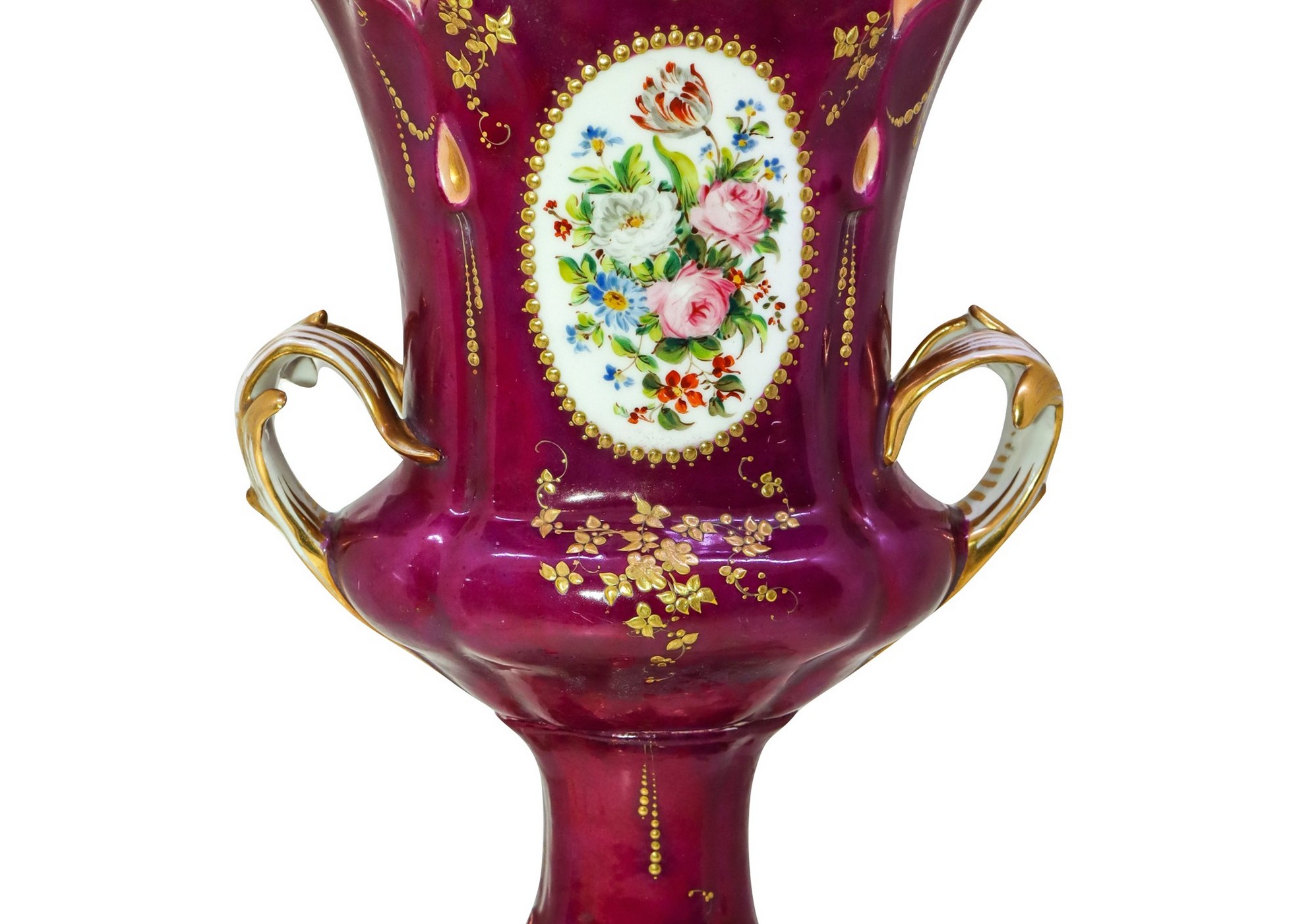 Vaso biansato in porcellana, Nineteenth century h cm 35 Dipinto con ovali floreali su recto e sul verso, decori in oro su base viola.