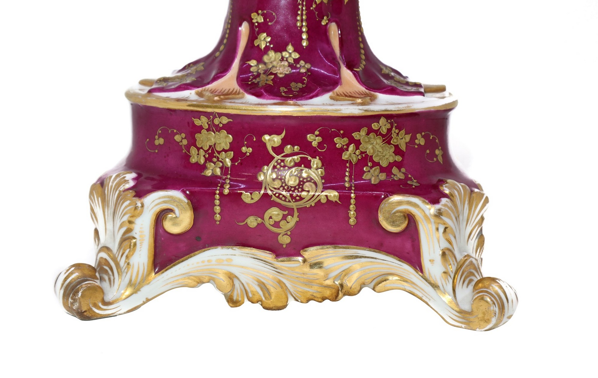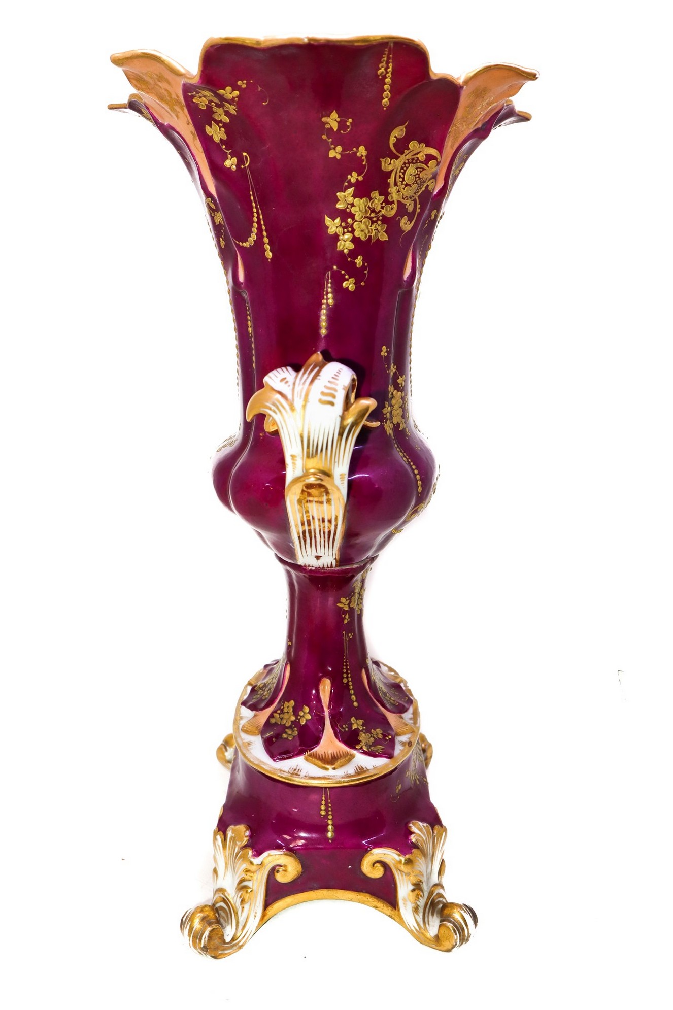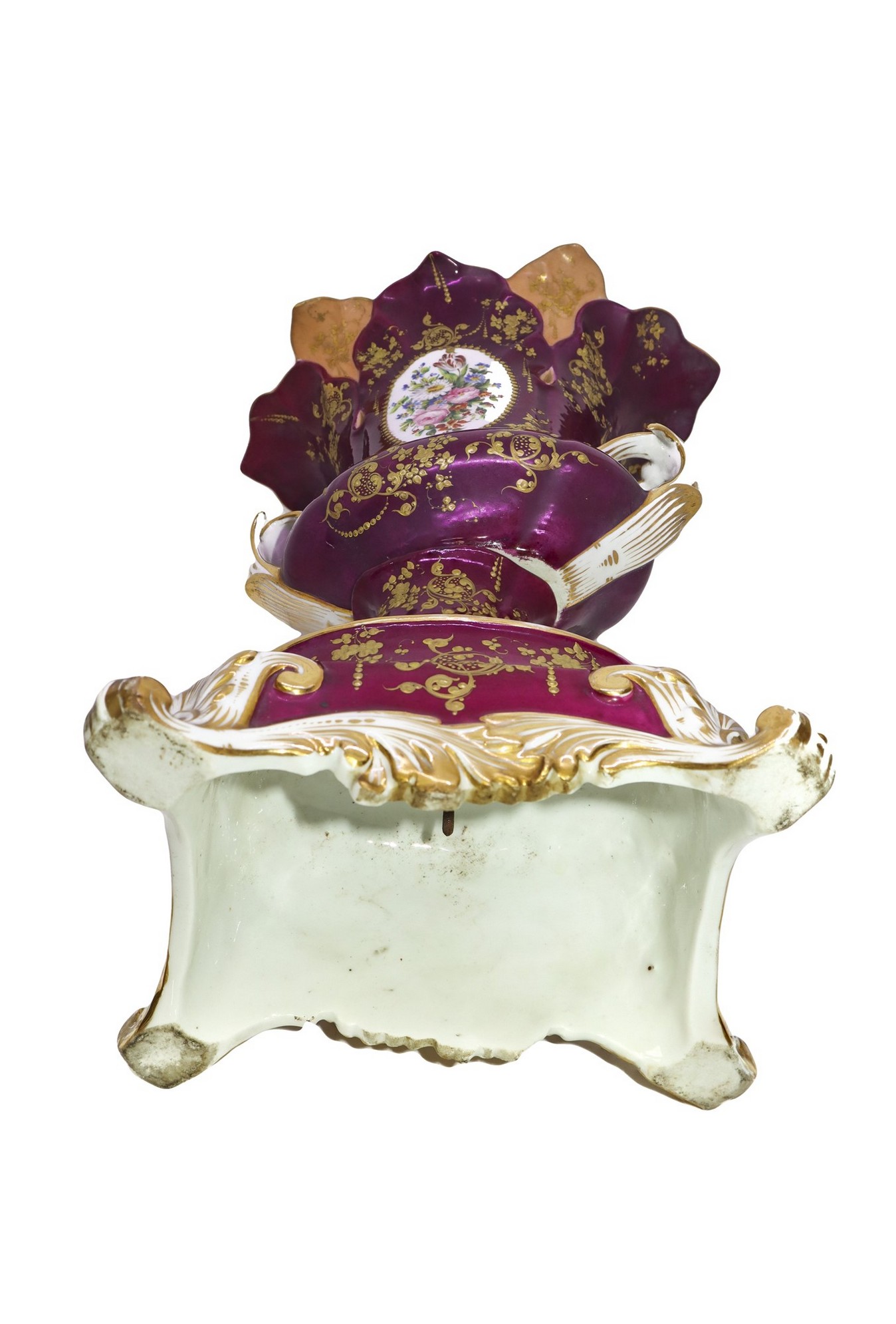 Vaso biansato in porcellana, Nineteenth century h cm 35 Dipinto con ovali floreali su recto e sul verso, decori in oro su base viola.
