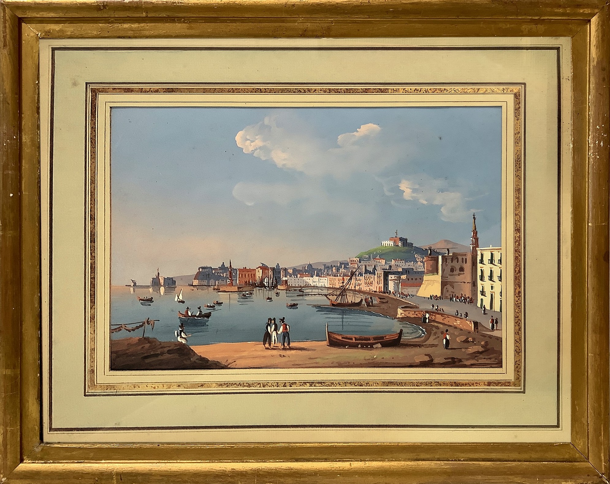 Dipinto raffigurante golfo con barche e personaggi, Late 19th century cm. 15 x 22 in cornice 29 x 36.5. Gouache su tavola