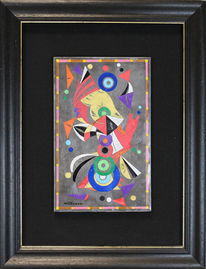 UMBERTO MASTROIANNI, "Teseo scopre il d'oro", 1976, Olio su tela, Dim. 40,1x25,7, Al fronte: firmato in basso a sinistra, Opera accompagnata da autentica su foto dell'artista, Esposizioni: "Maestri contemporanei", Networking Italian and American Artist (Philadelphia Museum of Art 1985), "Juta e vetri", Galleria Editalia a cura di Floriano de Santi (Roma 1980), "Un furore creativo che scopre la luce della notte" a cura di Floriano de Santi , Museo d'arte moderna e contemporanea (Palazzo Mirbachov Bratislava 2008), Opera con cornice