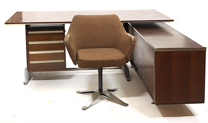 ROSSELLI ALBERTO Scrivania e poltrona. Scrivania con piano in legno di teak e...