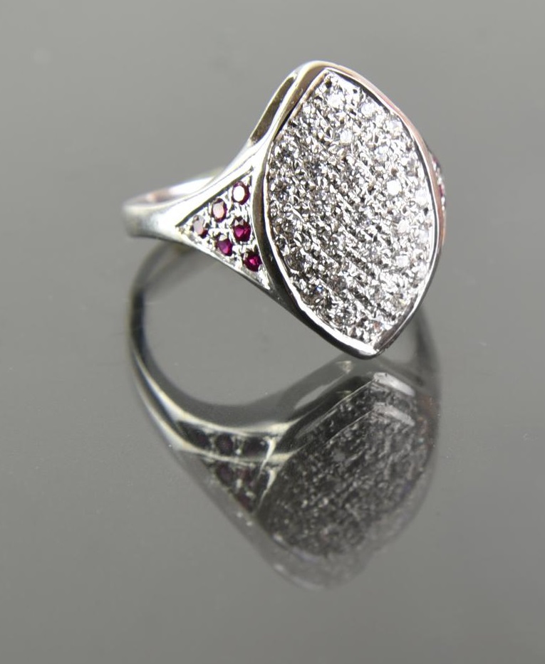 in oro bianco 18kt, modellato a navette con al centro pave' di piccoli diamanti e, ai lati, 6 rubini per ciascuno. Peso complessivo gr. 5,95, misura 17