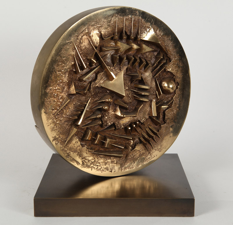 ARNALDO POMODORO (1926-) Ruota 1995 bronzo dorato diametro cm 30x8 esemplare 5/9 firmato sulla base autentica su foto dell'artista timbro della galleria d'arte Dante Vecchiato, Padova esposizioni: Zurigo 1996; Finalborgo 1997;San Francisco 1998;Los Angeles 1999 letteratura:Arnaldo Pomodor...