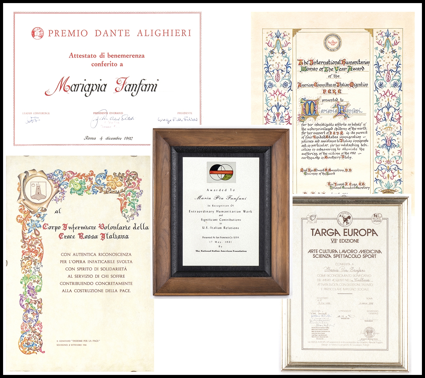 Lotto composto da cinque differenti attestati per Maria Pia Fanfani, premi e riconoscimenti vari, Premio Dante Alighieri, Woman of The Year 1981, National Italian American Foundation