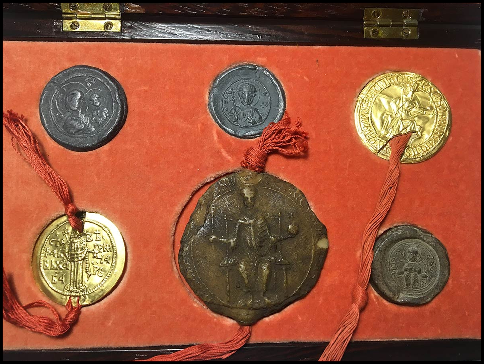 Cofanetto con 6 sigilli riproduzioni moderne di cui uno in AU 0,750 (ca. 17 g) e uno in metallo dorato (ca. 19 g).