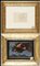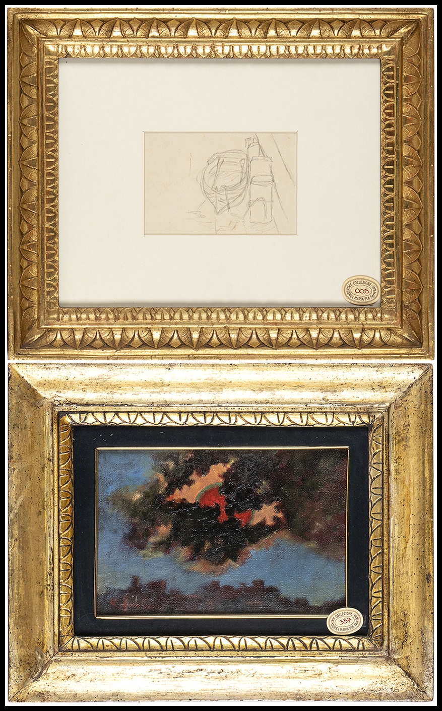 Lotto di due composizioni originali firmate Amintore Fanfani "Barca al molo" matita, "Tempesta solare o sole apocalittico" olio 1986. In cornice