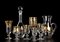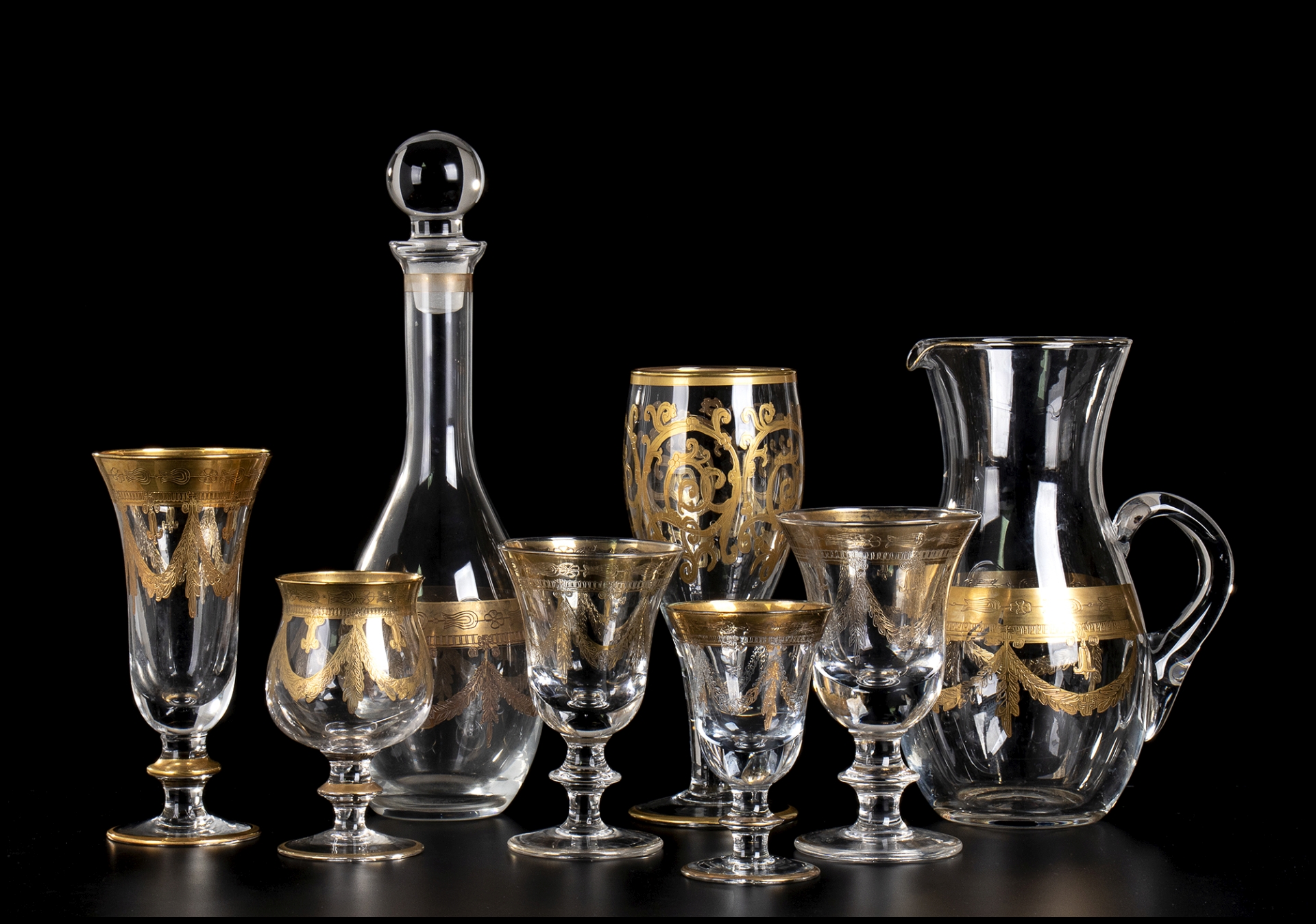 Parte di servizio di bicchieri in cristallo stile Venezia, bordo inciso all’acido e arricchito da doratura. Composto da: 69 da acqua, 111 da vino bianco, 107 da vino rosso, 79 flute, 67 da liquore, 28 coppe, 16 da bibita (totale pezzi 487)