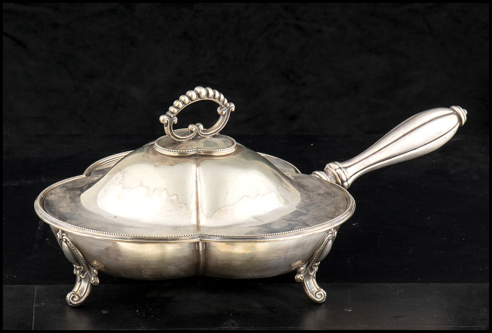 forma a trifoglio con manico laterale. Punzonata " A & N - CV - L - Warranted Hard Soldered". Dimensioni: 8 x 43,5 x 27 cm. Peso 1739 gr circa.
