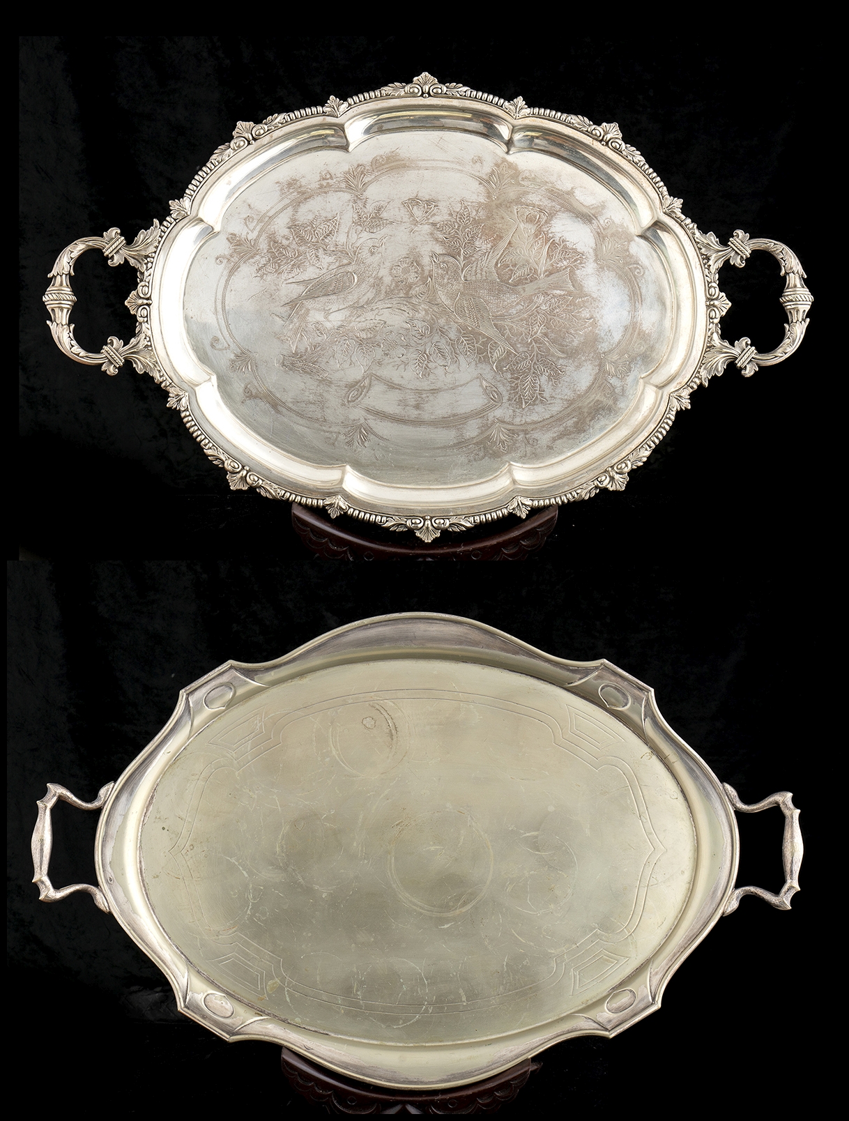 1) di forma ovale sagomata con manici laterali, argentiere William Hutton & sons; citta di Sheffield. Dimensioni con manici e pesi: 73 x 46 cm, 3100 gr circa. 2) di forma ovale sagomata con manici laterali e decori a motivi floreali e animali. Dimensioni con manici e pesi: 68 x 43 cm, 2750 gr circa.