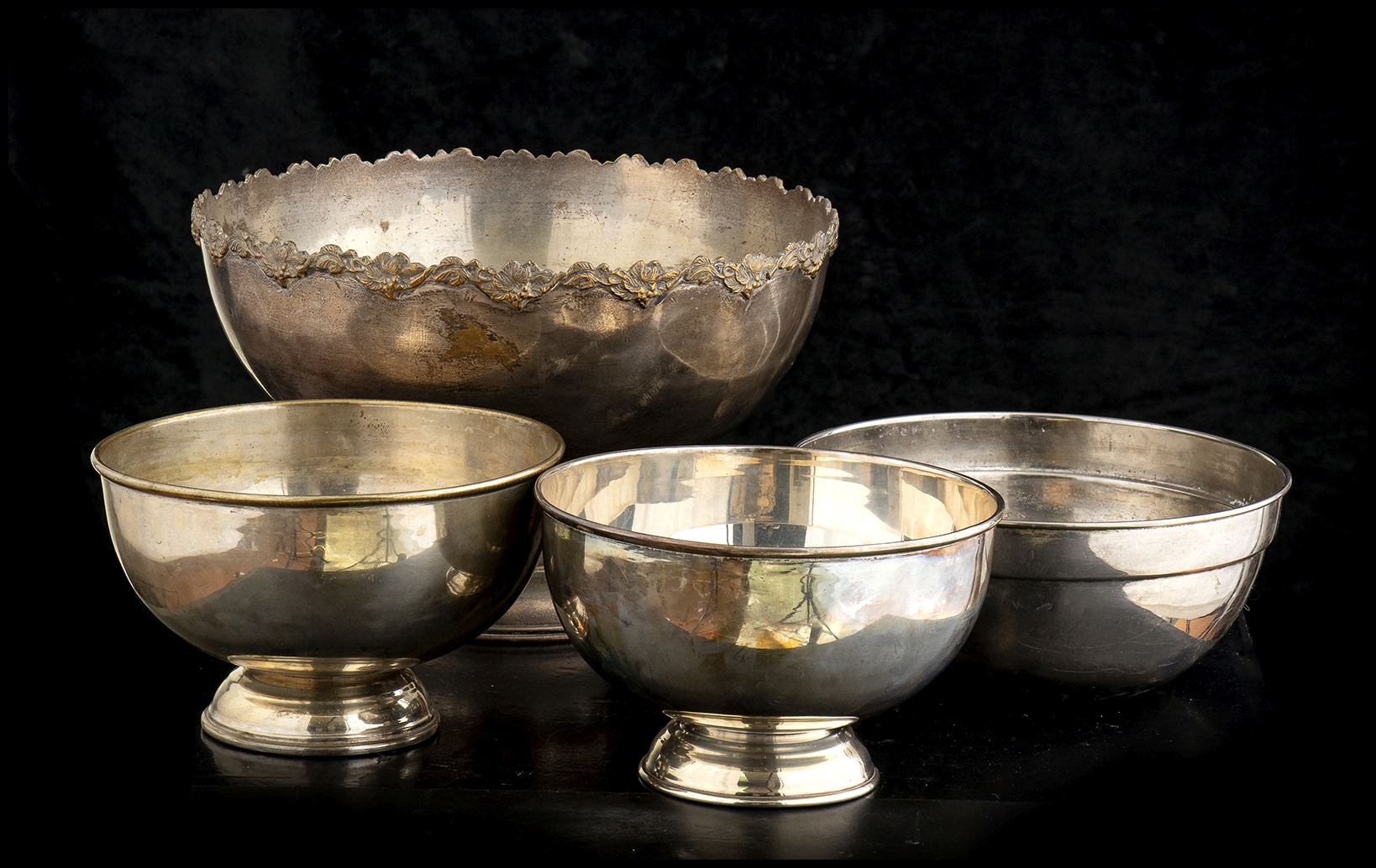 di forma circolare punzonata "silver plated", altezza 11,5 cm, diametro 23,5 cm, peso 430 gr; di forma circolare punzonata "e.p.n.s.", altezza 20,5 cm, diametro 31 cm, peso 1770 gr; coppia di forma circolare punzonate "e.p.n.s.", altezza 14 cm, diametro 21 cm, peso 1450 gr.