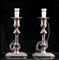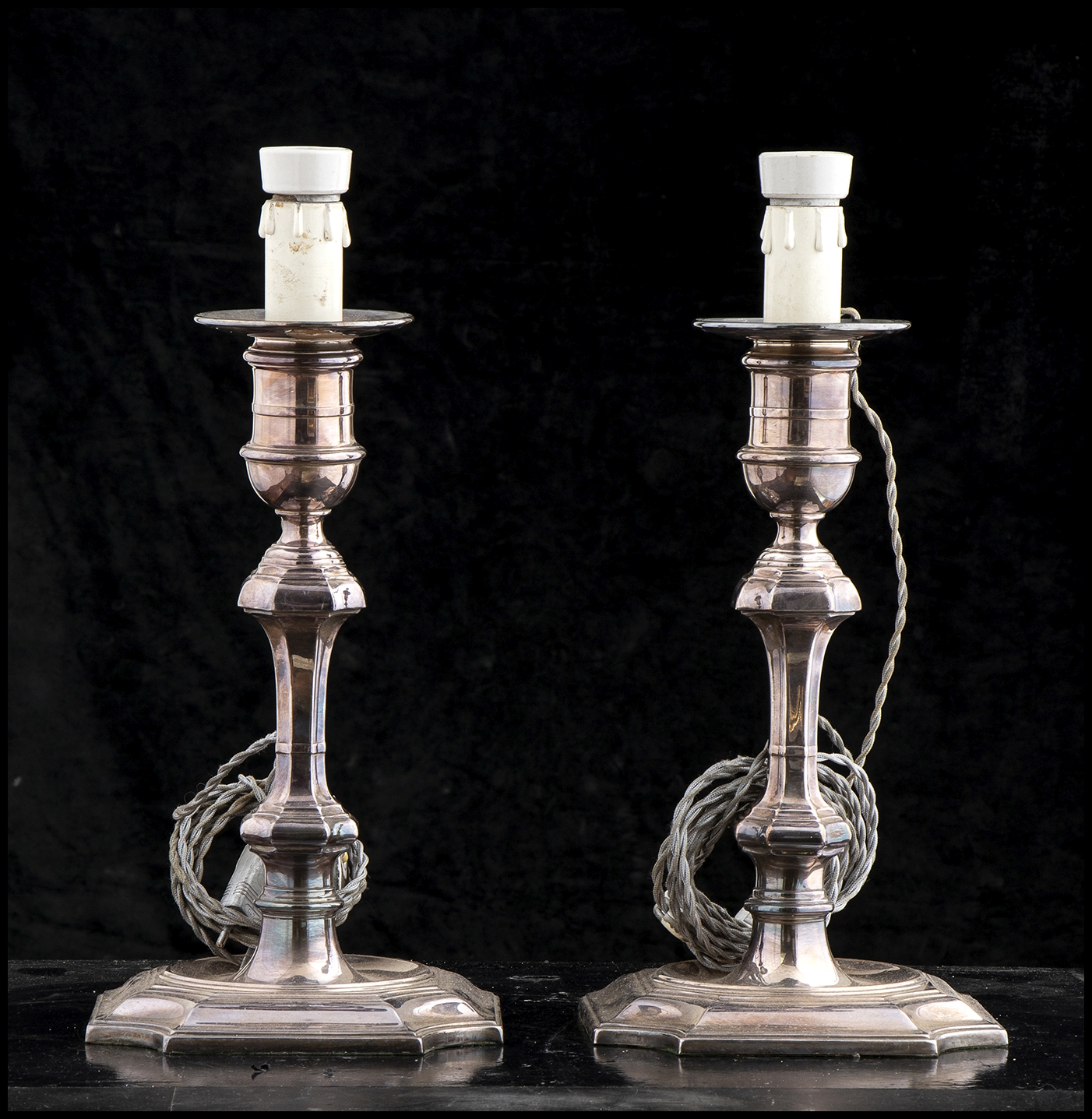 base quadrata con angoli concavi e fusto a balaustro. Altezza 40 cm, lato base 19 cm. Peso complessivo 4040 gr circa.