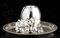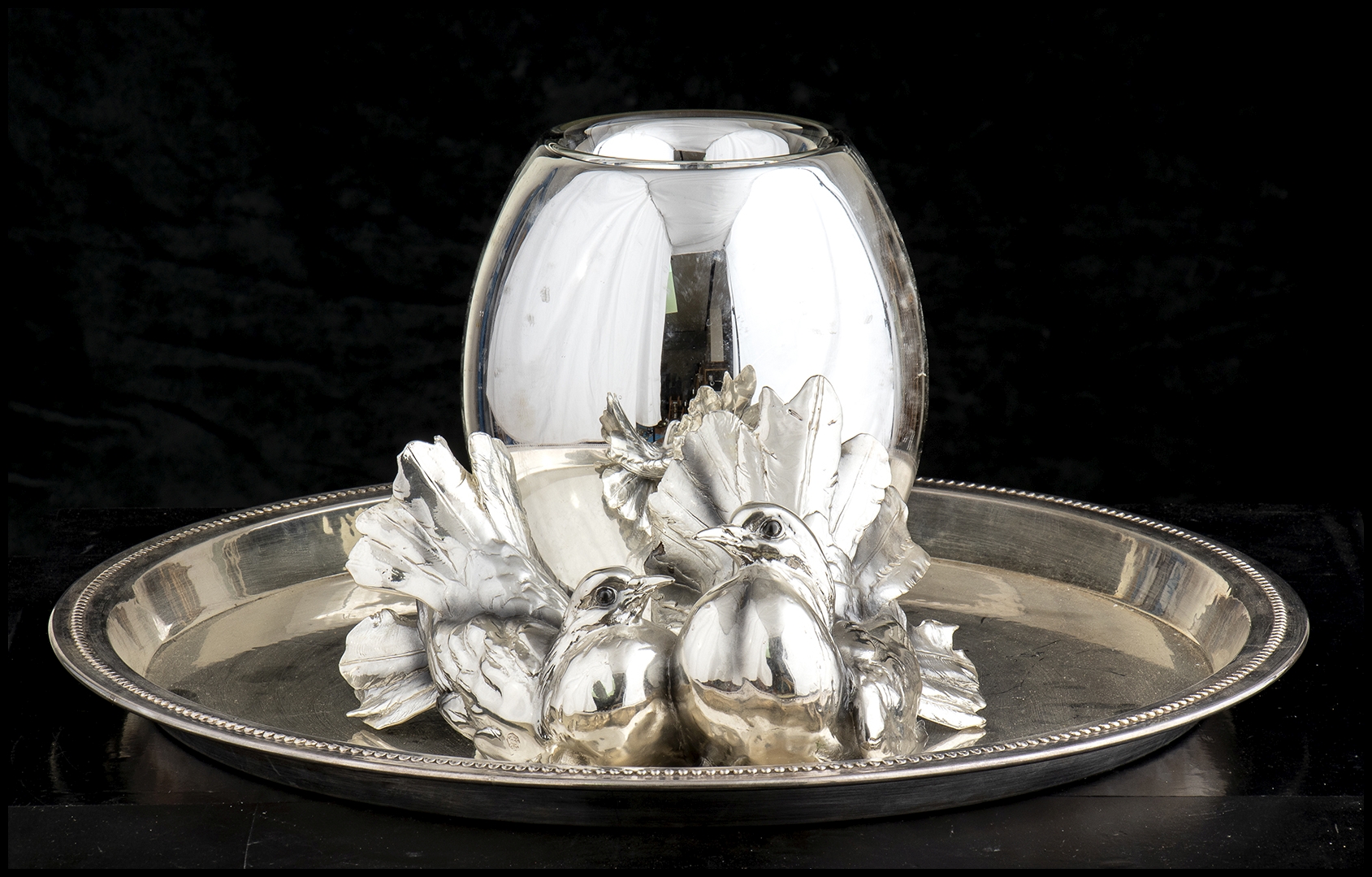 vassoio di forma rotonda con bordo perlinato, punzonato "Calegaro", diametro 49 cm, 1780 gr circa. Contenitore thermos di forma bombata, altezza 20 cm, diametro 18 cm, 670 gr circa. Due colombe firmate "Ottaviani", dimensioni 13 x 24,5 x 18 cm, 1680 gr.
