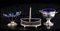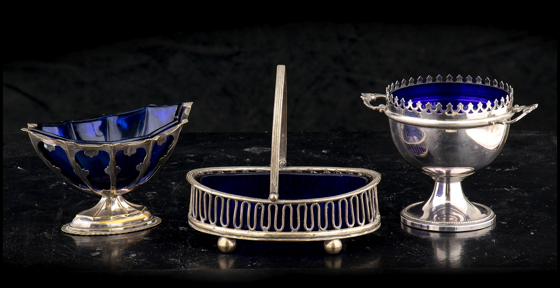 di forma ovale con manico e contenitore in vetro blu, 14 x 15,8 x 11 cm, 610 gr circa; di forma ovale sagomata con contenitore in vetro blu, 9 x 15 x 10 cm, 230 gr circa., punzonato "RD. Nr. 421101; di forma rotonda con manici laterali e contenitore in vetro blu, altezza 11, diametro 10 cm, 175 gr circa.