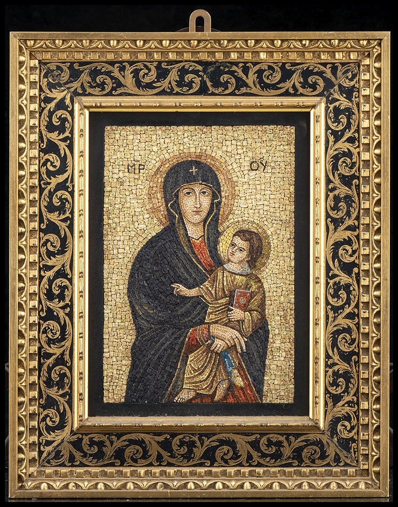 mosaico su tavola, raffigurante "Salus Populi Romani" Al verso iscrizione "Dono di S.S: Giovanni XXIII all' On. A. Fanfani - 11.IV.1961". Dimensioni 41,5 x 34 x 4 cm.