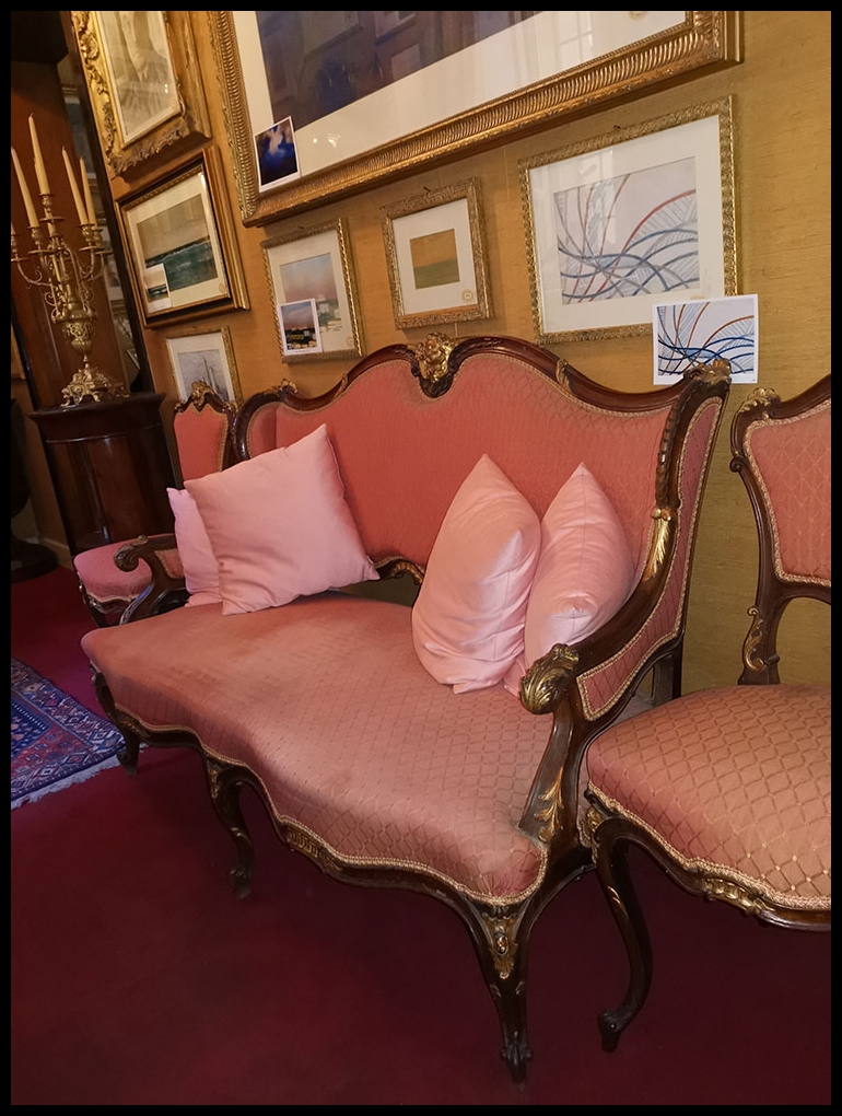 di linea sagomata con ornamenti dorati, spalliera e sedute imbottite ricoperte in stoffa rosa, stile '800.