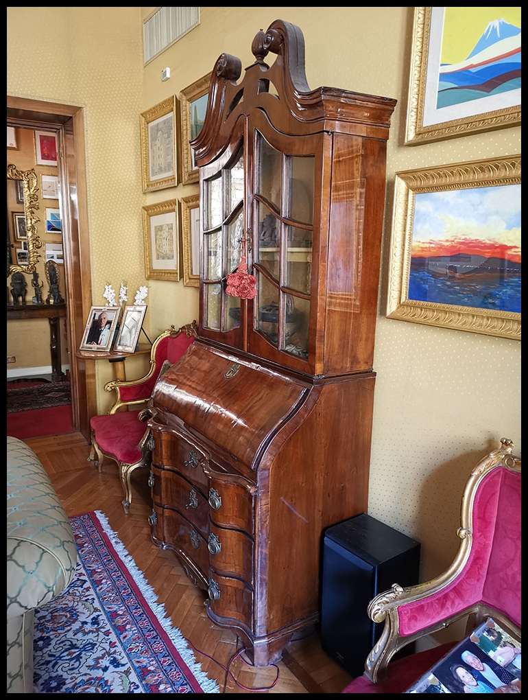 impiallacciato in noce, fronte linea mossa, parte inferiore con ribalta e tre cassetti sotto il piano, parte interna di restauro, nove cassettini e 1 vano, parte superiore (non pertinente) a due sportelli in vetro, cimasa a volute, sec. XIX (molti restauri). Dimensioni: 124 x 60 x 230 cm.