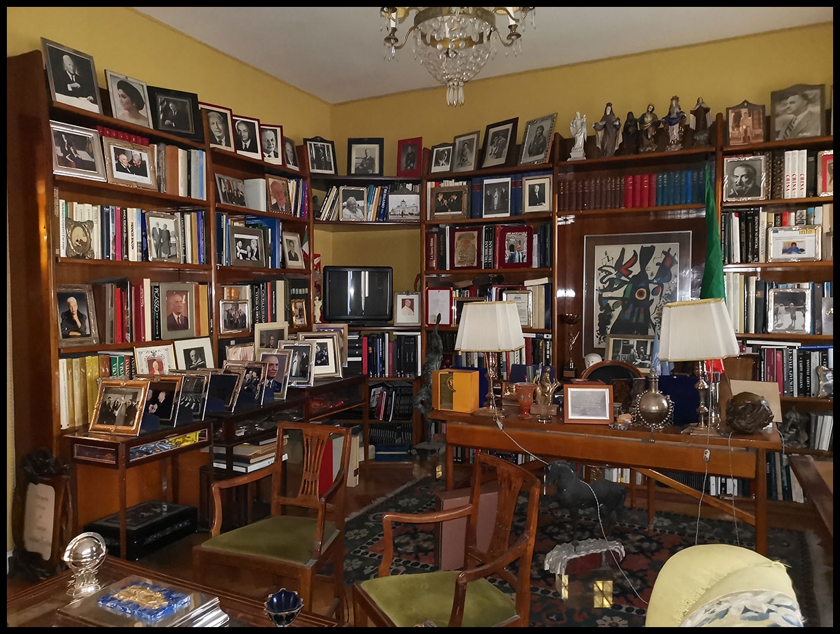 impiallacciata in noce composta da cinque settori con ventisei ripiani, una parte angolo con cinque ripiani e parte bassa con quattro ante (studio del Presidente).