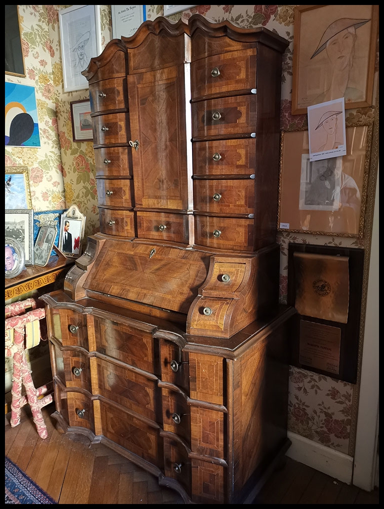 in noce e radica, alzata prospetto architettonico, sportello centrale fiancheggiato da dieci cassetti, quattro cassetti ai lati della ribalta, tre cassetti sotto il piano, all'interno della ribalta quattro cassettini e uno sportellino, Austria sec. XIX. Dimensioni: 180 x 84 x 52 cm.