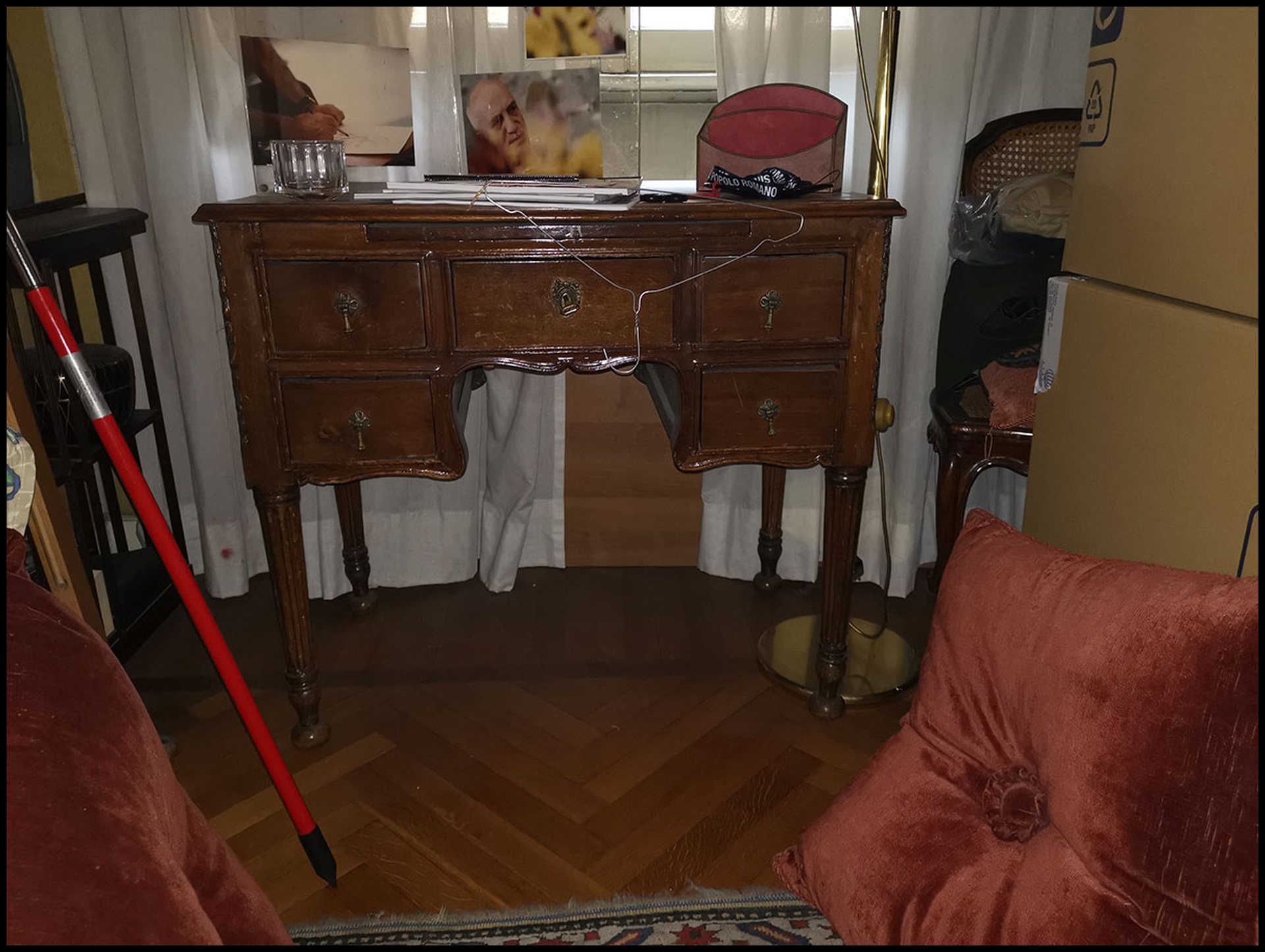 in legno noce, cinque cassetti. Dimensioni: 88 x 52 x 80 cm. Sedia in legno e paglia di Vienna.