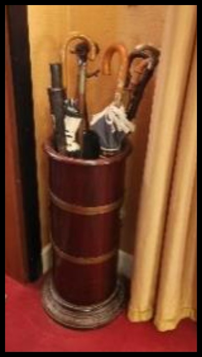 di forma silicdrica in legno di mogano con conteniore interno.. Altezza 68cm, diametro base 35,5 cm, diametro orlo 32 cm.