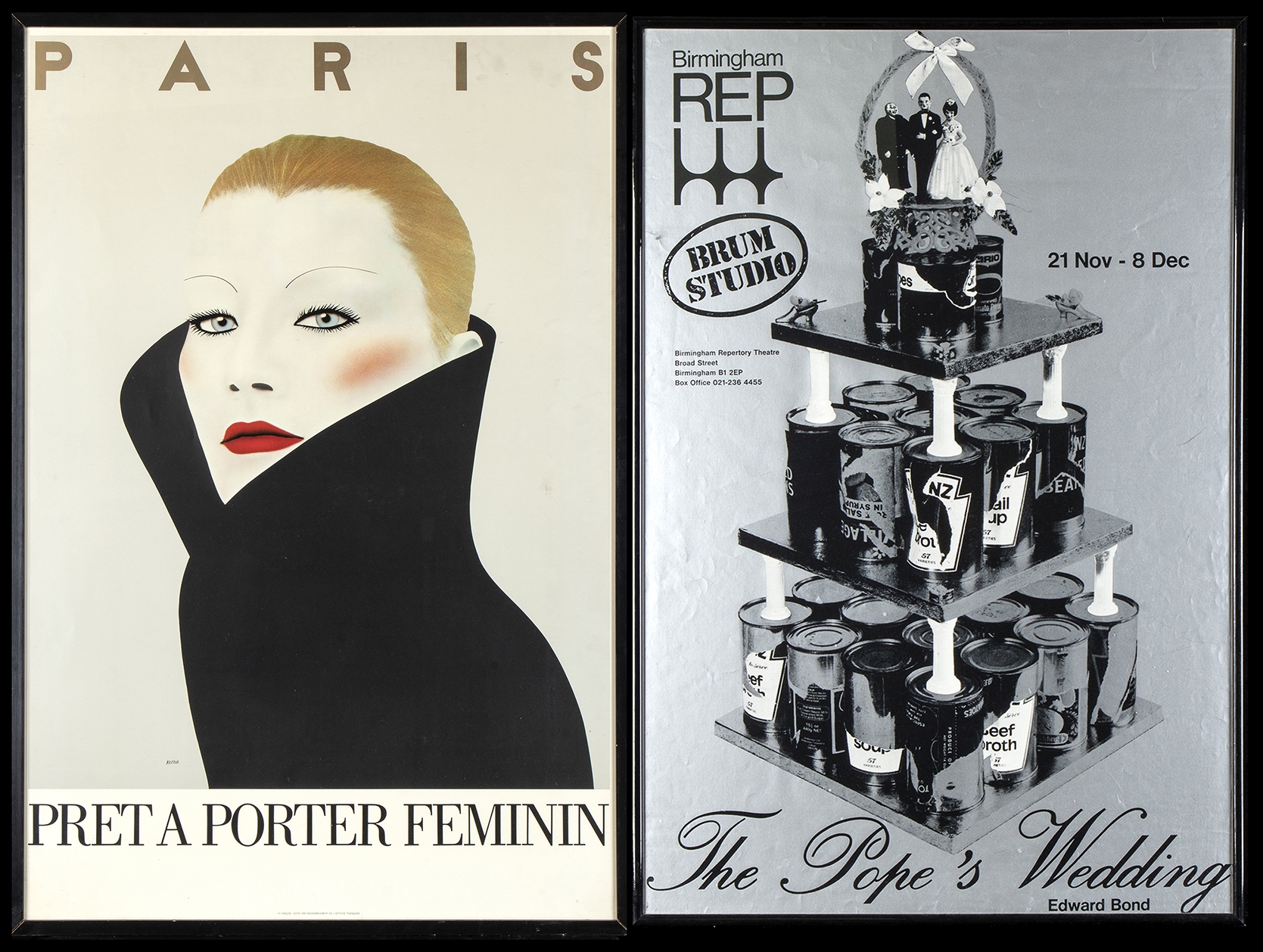 The Pope's wedding, Birmingham rep. Brum studio. Manifesto dello spettacolo al Birmingham theatre, 21 novembre - 8 dicembre; Pret a porter feminin, Paris, 1981, affiche firmata Razzia.