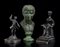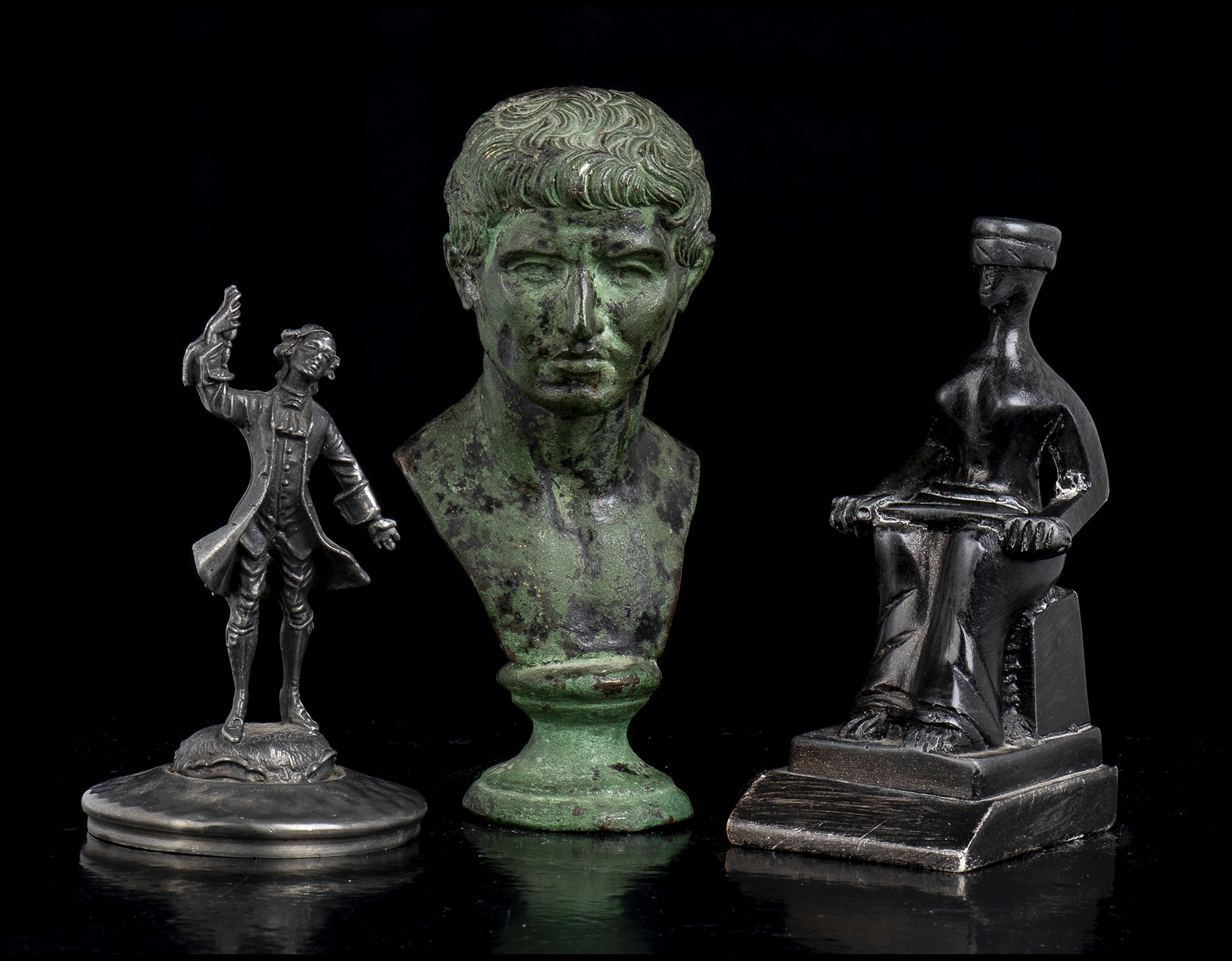 Busto in bronzo di imperatore romano su base a plinto, figura di uomo periodo settecentesco, e figura etnico religiosa seduta su trono