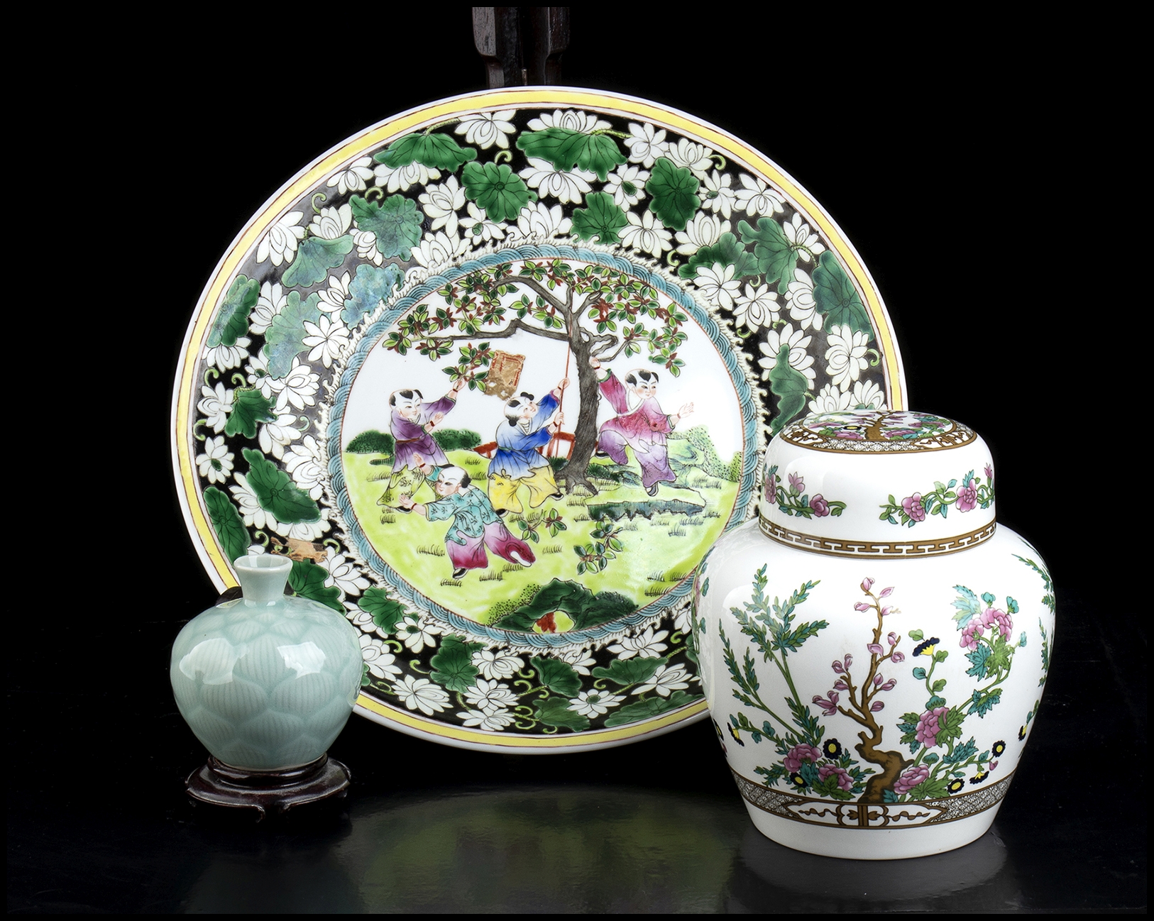 Lotto di set con piatto, vaso e vasetto in stile orientale