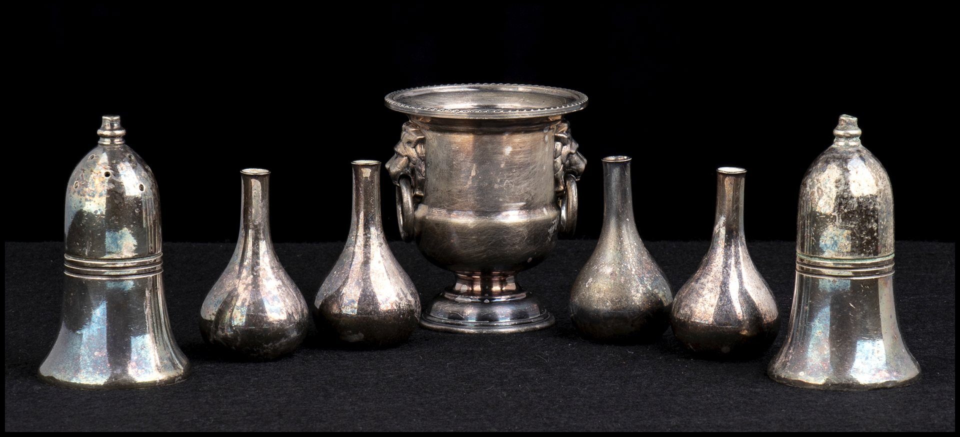 Lot 330 | Lotto di set con segnaposto, sale e pepe in lega argentata