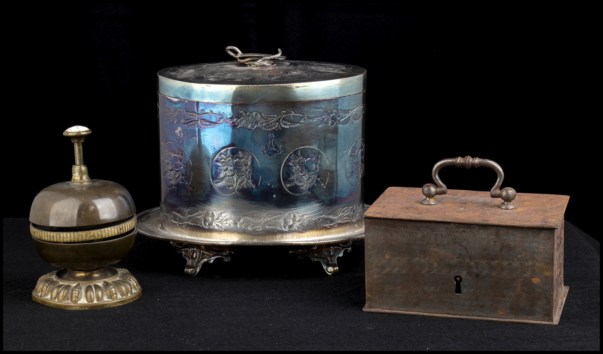Composto da: campanello da reception di hotel, biscottiera e cassetta di sicurezza da viaggio in metallo